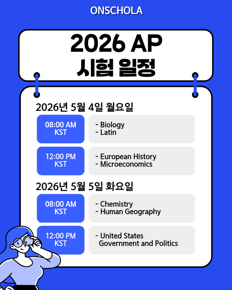 안녕하세요~ 오늘은 올해 2026년 5월에 있는 AP 시험 일정에 대해서 알아볼게요! 지금 다니고 있는 학교에서 AP 과목을 수강하면서 GPA와 5월 AP 시험을 함께 준비하는 학생들 학교에 원하는 AP 과목이 개설되어 있지 않아서 AP 시험만을 준비하는 학생들도 있겠고 미국 대학 준비를 위해서 필수라고 생각되는 AP의 크레디트를 아쉽게 놓칠 수 없어서 온라인 스쿨 싱글 코스로 AP를 수강하는 학생들도 있겠고 여러 케이스들의 친구들이 있겠지만 대다수 AP를 수강하는 학생들의 목표는 모두 AP 5점이라는 것은 확실할 텐데요! 그럼 AP 과목을 공부한 학생들이 2026년에 시험을 보는 날짜는 어떻게 될까요? 2026 AP 시험 일정 2026년 AP Standard ....... <img src="https://blogthumb.pstatic.net/MjAyNjA0MDhfMjEy/MDAxNzc1NjM1MDk2Njk2.az63WtHGYJU-nO6HtVASHDkbF_vfYWdvyPEzWM3BQkMg.tyFT4yZxJ8-NfbwjxlKtZnwfMY06vOXsoOWPqzXPZBsg.PNG/2.png?type=s3" />