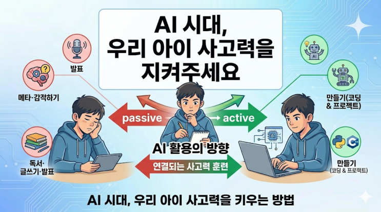 안녕하세요, 학부모님 요즘 아이들 공부 모습, 예전과 많이 달라졌죠? 모르는 것이 생기면 책을 펼치거나 선생님께 묻는 대신, 스마트폰을 열고 AI에게 바로 물어보는 것이 이제는 너무나 자연스러운 일이 됐습니다. 처음엔 "우리 아이가 도구를 영리하게 쓰는구나" 싶었는데, 어느 순간 이런 생각이 스치신 적 없으신가요? "AI가 답을 내주는 동안, 우리 아이는 뭘 생각하고 있는 걸까?" 이 질문, 사실 굉장히 중요합니다. 오늘은 AI 시대에 아이들의 사고력이 어떻게 달라지고 있는지, 그리고 디미고(한국디지털미디어고등학교)를 비롯한 IT특성화고를 준비하는 아이에게 어떤 방향의 공부가 진짜 도움이 되는지 이야....... <img src="https://blogthumb.pstatic.net/MjAyNjA0MjFfMTQ2/MDAxNzc2NzUyOTc2OTc5.AnT6dbzmWk9haQpUZDzctALNeFJysRPvFes5HyAmYpgg.YXyr-L6Vphv-__EG6mUHVPu2-hR3BCEgEhuVSE97GeUg.PNG/image.png?type=s3" />