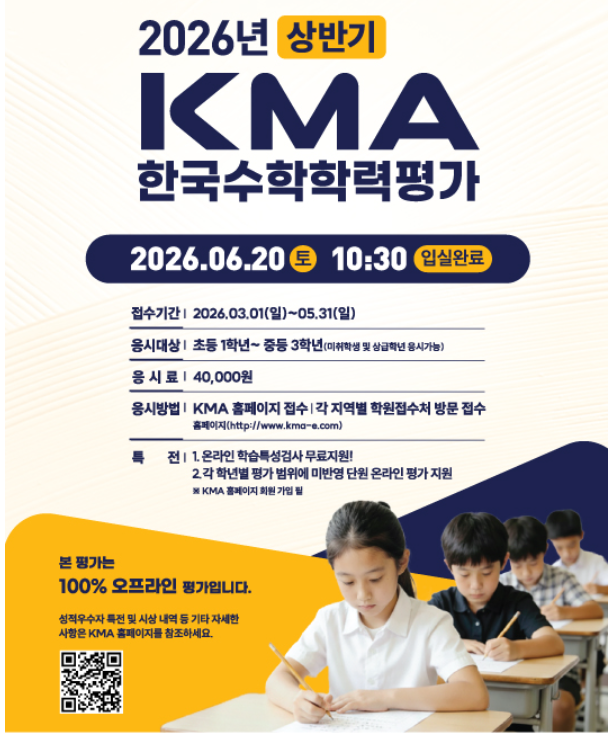 2026년 상반기 KMA 시험이 2026.6.20 (토) 예정입니다. 시험이라는 것이 결과가 좋으면 더없이 좋겠지만 준비하는 과정에서 많이 성장합니다. '경험'해 보는 것이 중요하죠~ 살짝 어려움을 넘겨보기도 하고 낯선 환경에 놓여보기도 하고 또래 아이들과 경쟁이라는 것도 해 봅니다. 작년에도 아이들 KMA에 많이 나가서 상도 받고 메달도 타고 사진촬영하면서 좋아했던 거 같아요. https://blog.naver.com/bmsoma/223961450458 백마소마에서 재원생 KMA 시험 접수 중입니다. 비재원생도 접수 가능합니다. (시험 장소는 아니니 참고해 주세요) 백마소마 사고력수학/교과심화수학 031-902-6543 <img src="https://blogthumb.pstatic.net/MjAyNjA0MThfMjgw/MDAxNzc2NDg5NDI0OTI5.tF45j1PC1rjbzFB-OOqD-13HrpNxOJcACDrDZh4DIEsg.ydX4kyBySK8mcEmnhnov1nQsX_UR8dsO7IjeflKJrBsg.PNG/image.png?type=s3" />