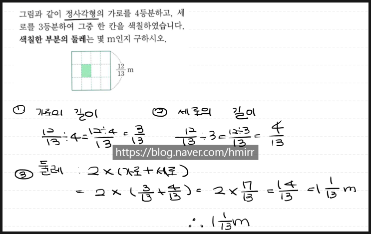 안녕하세요. 오늘은 6학년 1학기 1단원 분수의 나눗셈 중 2문제를 갖고 왔습니다. 이 문제는 넓이 구하는 문제로 더 많이 나오는데 둘레를 구하는 문제가 있어서 갖고 와 보았습니다. 직사각형의 둘레= 2 x (가로 + 세로) 다 알고 계시죠?? 가로와 세로는 분수의 나눗셈과 곱셈을 이용하여 구할수 있지만 단원이 분수의 나눗셈이니 나눗셈을 이용하여 구하면 좋겠죠?? 분수의 곱셈으로도 계산할수 있습니다. 단원의 특성에 맞춰 잘 계산하면 어렵지 않게 풀수 있었을 문제들 입니다. 분수와 자연수의 곱으로 이루어진 문제들은 계산할 때 헤깔릴수 있으니 둘 다 분수의 형태로 고치고 계산하면 실수를 줄일수 있습니다^^! 상담문의 010.2378....... <img src="https://blogthumb.pstatic.net/MjAyNjA0MDdfMTI5/MDAxNzc1NTM2MjM3MDE5.fyf9nhP-nC8MkNk2JjMn8yR6cKT5Qbj4rxEN1qvQensg.Rqx8QQVkYzg6U_sDARsPl9StANrlLo3gokFSraZUx-4g.PNG/image.png?type=s3" />