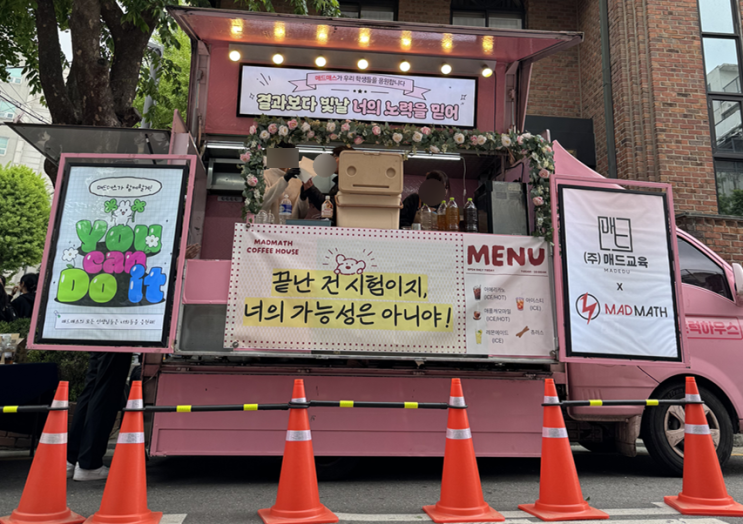 안녕하세요. 마포 수학학원 매드매스입니다. 2026년 1학기 중간고사를 맞아 저희는 학생들의 집중력 유지와 컨디션 관리를 위해 시험응원 이벤트를 진행하였습니다. 홍익여고 앞, 매드매스 푸드트럭 이벤트 시험을 앞두고 바쁜 일정 속에서 매드매스 재원생 친구들이 잠깐 들러 부담 없이 먹고 갈 수 있도록 준비한 자리였는데요~ 선생님들과 가볍게 인사를 나누고 응원의 한마디를 건네는 모습들도 이어졌습니다. 이러한 시간들이 학생들이 보다 편안한 상태에서 시험에 집중할 수 있는 계기가 되었기를 바랍니다. 학생들에게 제공되는 이벤트 메뉴로는 음료와 츄러스 등 간단하게 먹을 수 있는 구성으로 준비했는데요~ 짧은 시간 안에 에너지를....... <img src="https://blogthumb.pstatic.net/MjAyNjA0MjhfMTQ1/MDAxNzc3MzQ0NTc4ODkx.TxNBdvm8t393v6dvAaeNSujsMD1DebvShoihc5Q7C90g.9rI2Hqa9rXgooHLb0dMoS6Xe7_THVD7tnCpM_q06Qsgg.PNG/image.png?type=s3" />