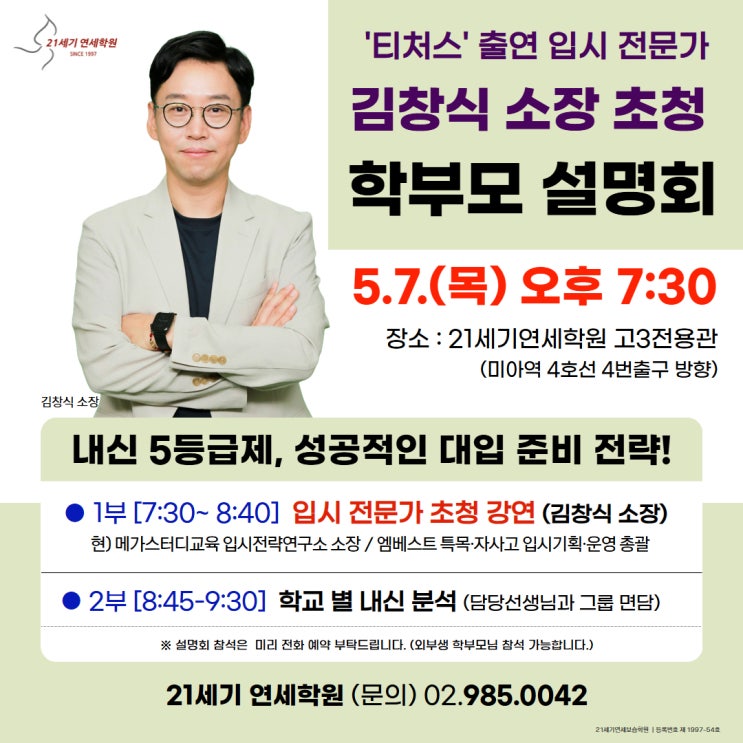 안녕하세요, 21세기 연세학원입니다. 다가오는 학부모 설명회 일정을 안내드립니다. ● 김창식 소장 초청 학부모 설명회 중요한 1학기 중간고사를 앞두고 학부모님의 걱정과 고민이 많으실 것으로 생각되어 입시 전문가이자 '티처스' 출연으로 잘 알려진 김창식 소장님을 모시고 지역의 실정에 맞는, 성공적인 대입 준비 전략에 대해 알려드리고자 학부모 설명회를 준비하였습니다. ● 대상: 현 고1, 중3 학부모님 ● 일시: 5월 7일(목) 오후 7:30 ● 장소: 21세기연세학원 고3 전용관 (미아역 4호선 4번 출구 방향) [1부 | 7:30~8:40] 입시 전문가 김창식 소장 특강 – 메가스터디교육 입시전략연구소 소장 – 엠베스트 특목·자사고·입....... <img src="https://blogthumb.pstatic.net/MjAyNjA0MDhfMTM0/MDAxNzc1NjM3MTM2Mzg4.NQC-tjuahMXJYZEd3PCktJhpTK_eMdZTHxbVZ829JjQg.GtDB99b49AYDUxPvirzNyjuBEJwETTIMOVVnajFDHcwg.JPEG/%BA%B9%BB%E7%BA%BB_%C7%D0%BA%CE%B8%F0%BC%B3%B8%ED%C8%B8_%283%29.jpg?type=s3" />