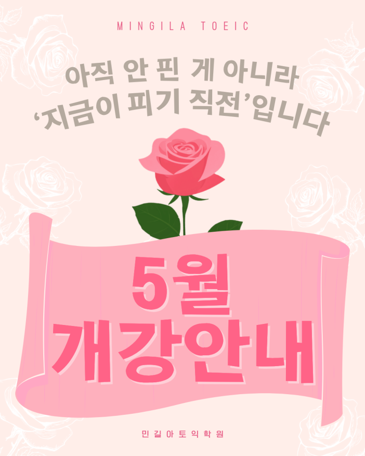 안녕하세요 민길아토익학원입니다~ 날씨가 정말 좋은 요즘 어느새 5월을 앞두고 있어요~ 모두 봄 나들이 꽃놀이 잘 즐기셨을까요~? 이젠 여러분의 점수가 필 차례입니다~ 토익/토익스피킹/오픽 점수가 필요한데 어떻게 해야할지 모르겠어요 하반기 취업시즌을 노리는데 시작을 어떻게 해야할지 모르겠다면?! 중간고사도 끝나고 1학기 중에 어학 점수를 만들고 싶다면?! 민길아토익학원에서 어렵지 않게! 그리고 재밌게! 빠른 길로! 점수만들기 어떠신가요~ 노력이 쌓이고 작은 변화가 쌓이면 점수는 결국 ‘활짝’ 피어납니다!! 5월 4일 월요일 토익/토익스피킹/오픽 전 강좌 개강 5월 조기등록할인 이벤트 ?....... <img src="https://blogthumb.pstatic.net/MjAyNjA0MTNfNzMg/MDAxNzc2MDQ0MTg3ODAy.O9P-eQASmh78nShoV4xER7X9DXgL2RnWVcebXh0dhGsg.XJKAM9CZfcT2MQcFlWWZ9V4GFOSuQ3lIjfhFfm7-7Xog.PNG/1.png?type=s3" />