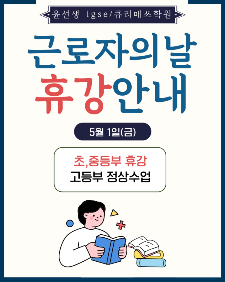 안녕하세요. 5월 1일(근로자의 날)은 초·중등부 수업은 휴강입니다. 고등부는 예정대로 정상 수업이 진행되오니 일정 착오 없도록 꼭 확인해 주세요 <img src="https://blogthumb.pstatic.net/MjAyNjA0MTZfMTcz/MDAxNzc2Mjk2MTQ4NjAx.He7c8PPbJgJWZAPMyYhFhLY1EiGd87zdpkNh7CISlaAg.NX0y9cNYXgqs804O-i_qCYRbkhdKdgpBN34sCeiNR7Ig.PNG/IMG%A3%DF2758.PNG?type=s3" />