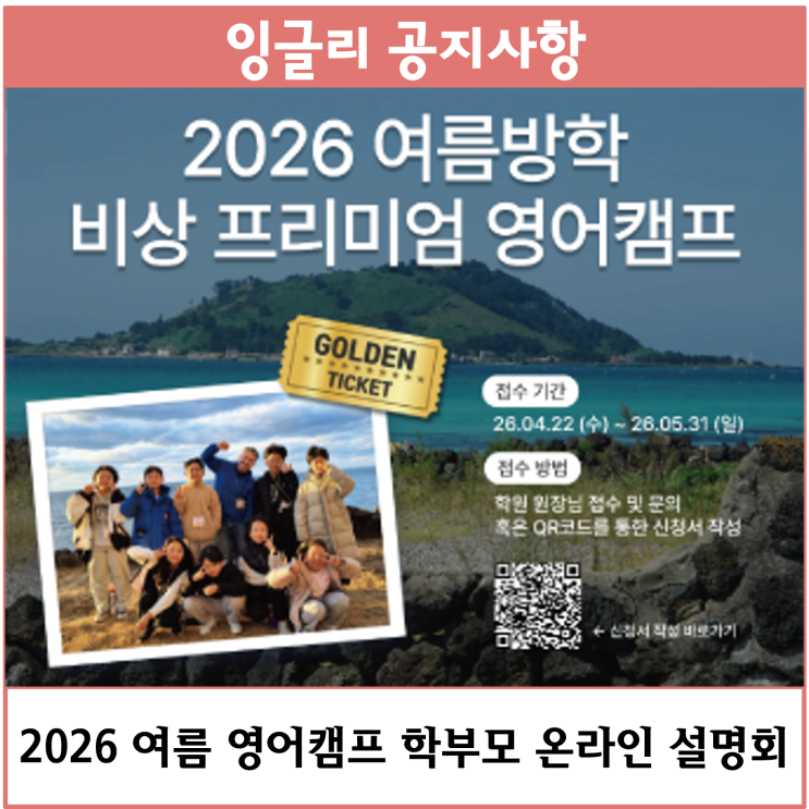 [잉글리시아이 학부모님 대상] 2026 여름방학 비상 프리미엄 제주 영어캠프 학부모 온라인 설명회 개최 안내