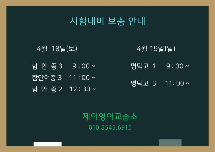 안녕하세요, 제이영어교습소입니다. 1학기 1회고사를 위한 보충일정안내입니다. 좋은 결과로 아이들이 자신감을 가지고 계속 영어를 잘 해나갈 수 있도록 최선을 다하겠습니다. <img src="https://blogthumb.pstatic.net/MjAyNjA0MTdfMjQ2/MDAxNzc2Mzg2NDY1MzYw.mLmwsSOqexwzoNz9AOory6KOiYxQhdlnqpNY-uojftcg.XrwI2-xrjTzwOHQgi0wsbhv7r9oFq_vVc77DVZ-9TPkg.JPEG/900_1776232142143.jpg?type=s3" />