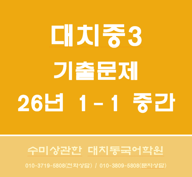 안녕하세요 수미상관한 대치동국어학원입니다. 이번 대치중 3학년은 재원생 3명 중 2명이 100점을 맞았습니다. 나머지 1명은 다쳐서 학원을 직전과 정규수업을 못와서 점수는 기대치까지는 나오지 않았을 겁니다. 결국 2명이 시험을 봐서 둘다 100점이라면 시험을 잘 본 것일까요? 시험이 쉬웠을까요?^^ 시험지를 들여다 보겠습니다 중3은 여름방학 때부터 예비고1 수업으로 전환합니다. 수업은 4시간 + 희망자에 한해 문법 특강(1대1클리닉)을 진행합니다. 대치중 3학년 (일) 6시 ~ 9시 대치 수미상관한 대치동국어학원의 과제시스템은 그냥 '매일'입니다. 한 번에 많은 과제를 하는 것은 효율이 떨어질 수밖에 없죠. 하루에 한 번 밥....... <img src="https://blogthumb.pstatic.net/MjAyNjA0MjZfMTgy/MDAxNzc3MTc5MjE0MjY3.FC90haOveI2v4PzW5cXcMhiafE6Qobw_zdXTwQfnFUog.ssZ1cM9E-K-VvE0ovhzHw_bYreGrhCMuk_PHhtFWNVAg.PNG/%BD%BA%C5%A9%B8%B0%BC%A6_2026-04-26_133544.png?type=s3" />