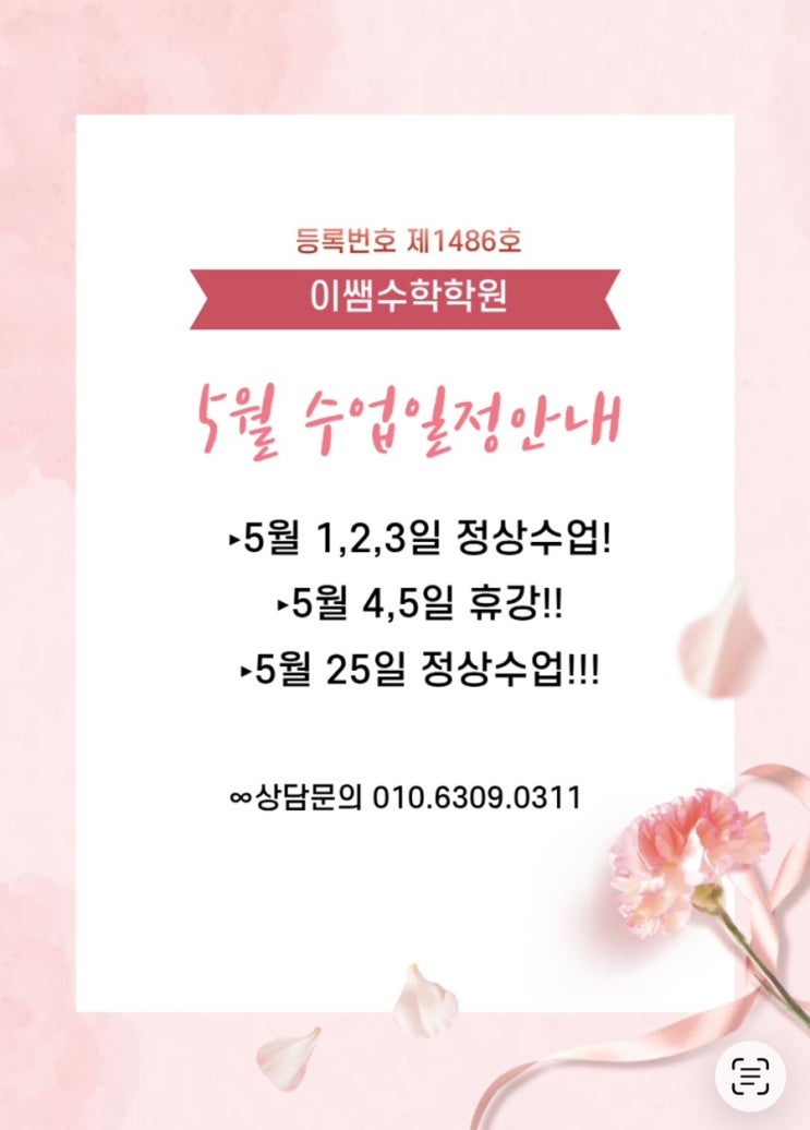 4월 마지막주는 내신 대비 초등 저학년은 새로운 리딩책으로 초등 고학년은 초등 그래머 마무리하기 각 클래스마다 계획데로 촥촥 잘 진행되고 있네요. 학생 여러분 모두 모두 고마워요 5월은 반가운 ? 빨간 날이 좀 많네요. 5/1 노동절로 26년부터 법적공휴일로 지정되어 5/5 일까지 휴원입니다. 잘 짜여진 학습플랜으로 더욱 알차게 즐겁게 쏼라쏼라 해 보아요 ~^^ 노베이스 및 시작하는 영어를 해야한다면 어려워하지 마시고 바로 문의부터 ! <img src="https://blogthumb.pstatic.net/MjAyNjA0MThfOSAg/MDAxNzc2NTE0MzUyMDk5.-wOwycEqz3wBXt17l6XEHESfPHotC-lkNQ_6M-CHQjog.Sij7K1_kqblUZFCSNp8WkvmEadCsbeOY0gFdpSLsA64g.JPEG/IMG%A3%DF1124.jpg?type=s3" />