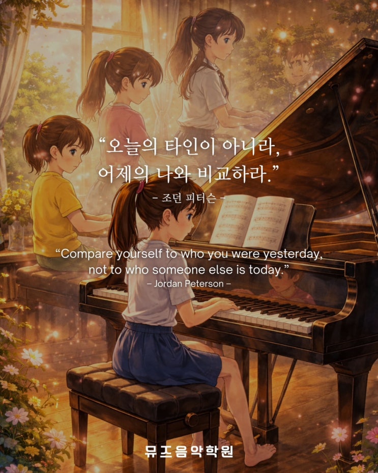 "오늘의 타인이 아니라, 어제의 나와 비교하라." 이 문장은 음악교육을 하는 부모님께 꼭 전하고 싶은 말입니다. 아이를 키우다 보면 비교는 너무나 자연스럽게 찾아옵니다. 누구는 체르니 30번을 들어갔다고 하고, 누구는 콩쿨에서 상을 받았다고 하고, 누구는 악보를 척척 읽는다고 합니다. 그 순간, 부모의 마음은 조급해집니다. '우리 아이는 왜 아직…'이라는 생각이 스며듭니다. 하지만 남과의 비교는 아이의 성장을 가속하는 힘이 아니라 아이의 마음을 흔드는 힘이 됩니다. 불안은 집중을 흐리고, 조급함은 음악을 서두르게 합니다. 그리고 서두른 연주에는 생각이 머물 자리가 없습니다. 반대로, 어제의 나와 비교....... <img src="https://blogthumb.pstatic.net/MjAyNjAzMTRfOTEg/MDAxNzczNDgxMTU5ODQy.qY9hDiAuC0nNkPczAilUx5TUppoIIQrEeScBoEjYrHEg.RODDdsZn3MnUfvd4ecYQfwJdN1tXyJG6ZGf_3SmaxB0g.JPEG/IMG%A3%DF5110.JPG?type=s3" />