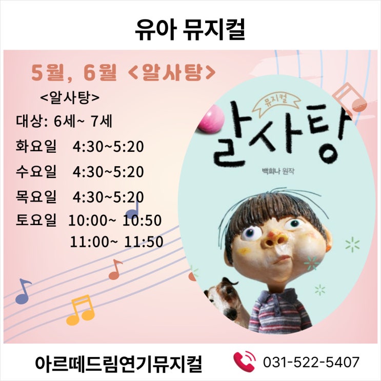 안녕하세요! 남양주다산유아뮤지컬학원 아르떼드림입니다. 5월,6월 아르떼드림 유아뮤지컬 수업은 백희나 작가의 <알사탕>입니다. 6~7세 맞춤 뮤지컬 수업, 이렇게 진행돼요 저희 수업은 한글로 진행되기 때문에 아이들이 가사와 대사를 더 잘 이해하고, 노래에 감정을 담아 부를 수 있습니다. 발성 연습: 피아노 반주에 맞춰 재미있게 목소리를 깨우는 시간 노래 배우기: 가사를 정확히 발음하며, 음악에 맞춰 감정 표현하기 율동·무대 동작: 노래에 맞춘 안무와 무대 동선 익히기 연극놀이: 친구와 함께 표현력·사회성 키우기 2명의 선생님이 함께해요! 한 반에 전문 뮤지컬·연극 선생님 2명이 함께 진행해요. 그래서 아이 한 명....... <img src="https://blogthumb.pstatic.net/MjAyNjA0MTdfMTkz/MDAxNzc2NDA2MzI4NDMw.r65XIRZ4q3LJpeHYsHBUrRAfWRAKKxm9XghOnQaoAzMg.NC82EuXsI8IfbTM3QcTIx8PTr-rSp9StldgEhbMLgTUg.JPEG/%C1%A6%B8%F1%C0%BB-%C0%D4%B7%C2%C7%D8%C1%D6%BC%BC%BF%E4_-001_%2812%29.jpg?type=s3" />