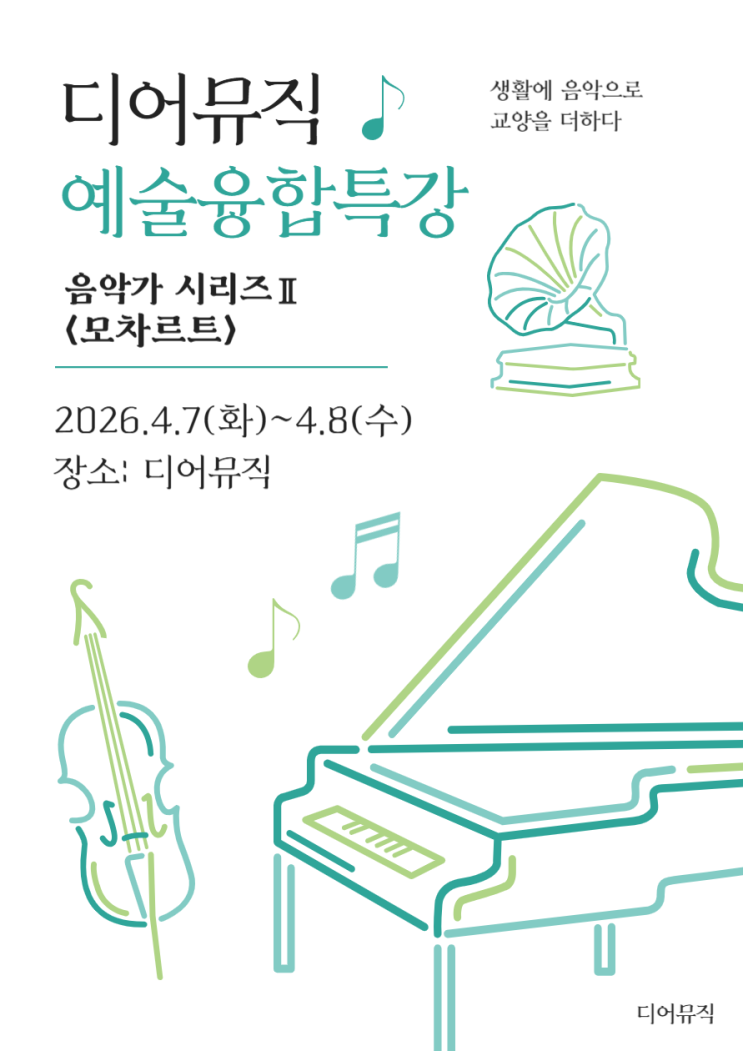 안녕하세요 " 즐겁게, 정확하게 배우는 피아노 " 디어뮤직 입니다^^ 이번달 예술융합특강 음악가 시리즈 제2탄 "모차르트" 입니다 그는 가장 위대하고 인기가 높은 클래식 작곡가 중 한명이며, 현재까지 음악에 미친 영향도 매우 크죠^^ 모차르트의 생애에 대해 얘기해 주고 완성시킨 후 영상으로 한번 더 모차르트는 누구인지에 대해서 알아봅니다~ 그리곤 그의 대표 소나타 " 터키행진곡 "을 들으면서 "모자이크 기법"으로 모차르트 위인전 표지를 만들어봅니다 다들 각자의 개성을 담은 모차르트 네요 마지막 인증사진까지♥ 오늘 특강 덕분에 쳄발로도 알 수 있었고 한뼘 더 발전하는 우리 디뮤둥이....... <img src="https://blogthumb.pstatic.net/MjAyNjA0MTVfMjg4/MDAxNzc2MjMzMTMzNjUw.yo7mqDIeJbdUM96CJverpjRdzTuJsy_ZGcEy3TLfOMUg.EGmIAx_fq2lxOLNeY-N1OD-y5GUt8_gwnOkeLoNVVXUg.PNG/%C1%A6%B8%F1%C0%BB_%C0%D4%B7%C2%C7%D8%C1%D6%BC%BC%BF%E4_-001_%284%29.png?type=s3" />
