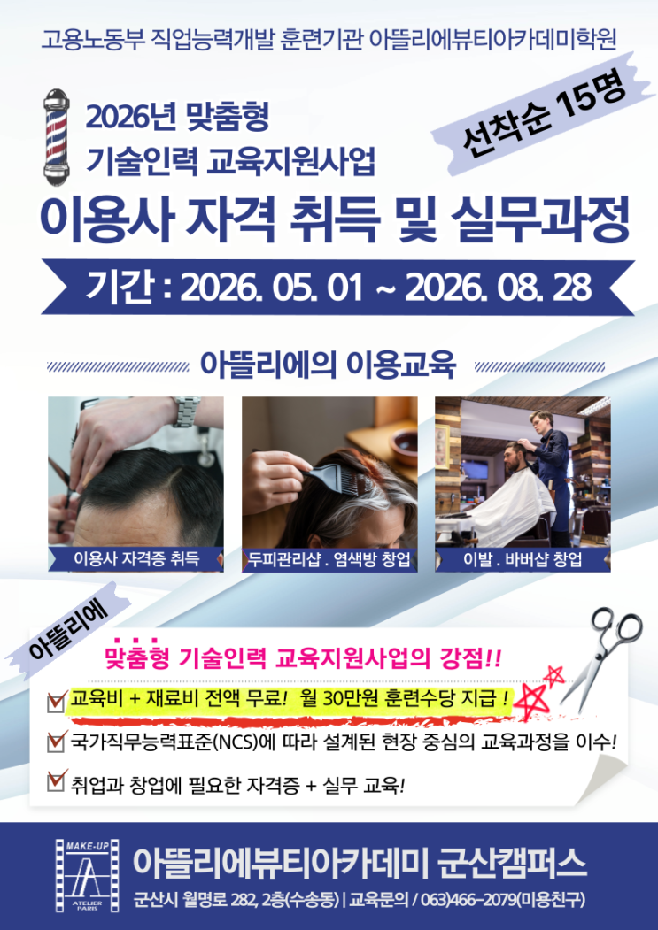 자격증부터 취업·창업까지 한 번에 준비하는 실무 중심 교육 안녕하세요. 아뜰리에뷰티아카데미 군산캠퍼스입니다 요즘 상담을 하다 보면 “기술을 배우고 싶은데 비용이 부담돼요…” “자격증 따고 바로 취업까지 가능할까요?” 이런 고민을 정말 많이 듣게 됩니다. 그래서 오늘은 비용 부담 없이 시작할 수 있는 실무까지 확실하게 배우는 과정 2026년 군산시 지원 교육과정을 소개해드리려고 합니다. 2026 맞춤형 기술인력 교육지원사업 * 이용사 자격 취득 및 실무자 양성과정 * - 교육기간 2026.05.01 ~ 2026.08.28 (약 80일) - 수업시간 오전반 09:10 ~ 13:00 (하루 4시간) - 모집인원 선착순 15명 마감 ?....... <img src="https://blogthumb.pstatic.net/MjAyNjA0MTZfNDIg/MDAxNzc2MzI4NDU3MTQz.CyGv7iCQ4Di60R1l9OFwxF0dDUndc6IlV7p5gw-S-2Mg.R3ZCMTjkERiz8s1hkw03iz5j5jDwikTGR8Op2Xn7JxIg.PNG/KakaoTalk_20260414_094800132.png?type=s3" />
