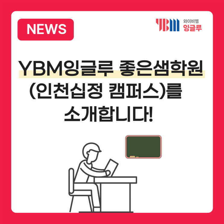 안녕하세요. YBM잉글루입니다~! 오늘은 인천 십정동에 새롭게 문을 연 YBM잉글루 좋은샘 학원을 소개해드리려고 합니다 :) 4월 1일 오픈한 YBM잉글루 좋은샘 학원은 따뜻한 공간과 원장님의 교육철학이 잘 담긴 아주 인상적인 캠퍼스였는데요, 함께 캠퍼스 투어 가보실까요? 멀리서부터 눈에 띄는 'YBM잉글루 좋은샘' 학원이에요! 컬러풀한 색감으로 입구부터 기분이 좋아졌답니다:) HALL 개방감 있는 벽면을 통해서 아이들이 오랜 수업 중에도 덜 답답해하게끔 창문을 만들어뒀어요. 알록달록한 색감의 캠퍼스 덕분에 개방감과 자유로움이 느껴졌답니다. 홀 공간은 학생들과 어머님들의 휴식공간으로, 언제든지 오셔서 아이들을 기다....... <img src="https://blogthumb.pstatic.net/MjAyNjA0MTdfMTAy/MDAxNzc2MzkxMDEyMjA2.gFKhm35e8Kc4OGzpq1KD9aDC8NDrto3tF68_uvE71HMg.IA89Im1btfzkQuloIKWC0k247Vj0SEZFA5O2PoxNztgg.PNG/4%BF%F9_%BC%C2%C2%B0%C1%D6_%BD%E6%B3%D7%C0%CF_%282%29.png?type=s3" />