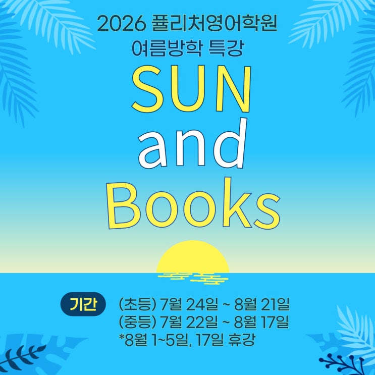 안녕하세요, 이촌동 퓰리처영어학원입니다. 햇살도 점점 따뜻해지고 있고 나무들도 푸르게 변하고 있죠. 눈 깜짝할 사이 여름이 올 것 만 같습니다. 여름방학에 맞춰 퓰리처는 영어 실력을 jump-up시켜주는 여름방학 특강 ‘Sun and Books’를 준비중이예요. 올 여름에는 이촌동 퓰리처영어학원에서 영어와 함께 시원하게 피서를 떠나볼까요? 여름방학 특강 스케줄 2026년 여름방학 구성 영어를 영어로 가르치는 몰입과정으로 학습을 이끌어나가며 학습자의 의사소통능력을 초등학교 때 최대로 끌어올려 글로벌 인재가 될 굳건한 기반을 마련해주는 퓰리처영어학원의 여름방학특강은 크게 월화수목금 월/수/금 화/목 수업으로 나눠져요. 우리 아....... <img src="https://blogthumb.pstatic.net/MjAyNjA0MTlfNzUg/MDAxNzc2NTgwNDM0MzMy.LXTVr04h9M4E9zxa7NCI6kgfIk1MAX_3C2fCNFDmzE8g.l1oMunVg29X6Xb5Cs55-ZxPB4UFujISJuIEcbjc9O4sg.JPEG/001.jpg?type=s3" />