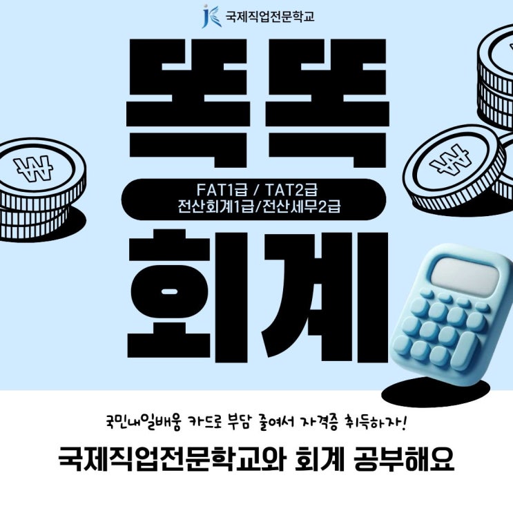 안녕하세요. 국제직업전문학교입니다. 안녕하세요 요즘 취업 준비하시면서 “뭔가 실무에 바로 쓸 수 있는 자격증 없을까?” 고민하시는 분들 많으시죠? 특히 사무직이나 회계 직무를 생각하고 계신다면 한 번쯤은 들어보셨을 전산회계 / 전산세무 / FAT / TAT 자격증! 이름이 비슷해서 헷갈리기도 하고, “이걸 내가 할 수 있을까?” 고민되셨던 분들도 많으실 텐데요. 결론부터 말씀드리면 처음 시작하는 분들도 충분히 도전 가능한 과정입니다. 회계 자격증, 뭐가 다른 걸까? 쉽게 설명하면 이렇게 나뉘어요 전산회계 / FAT → 회계 기초 (장부 정리, 회사 돈 관리) 전산세무 / TAT → 세금까지 포함 (부가세, 소득세 등....... <img src="https://blogthumb.pstatic.net/MjAyNjA0MjNfMzIg/MDAxNzc2OTI0MzMxOTQ3.aGT5d8b8RQeJT4yTDA58R8j5h4P6yJ-6hyiKQmJtETIg.kL3RQD6ovi6RSWtD5r04wm0ojKRzyQRdANN6_tKcycQg.JPEG/1.jpg?type=s3" />