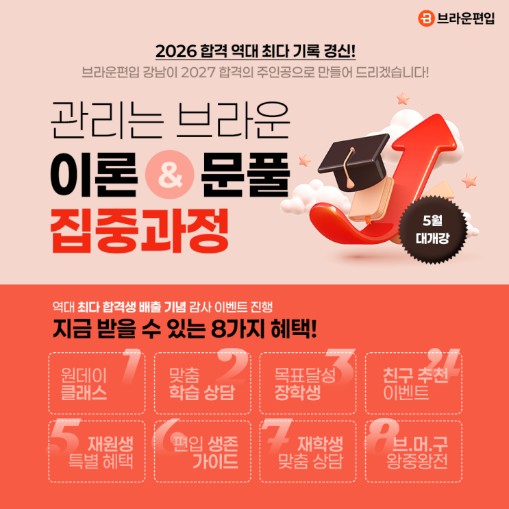 브라운편입이 2026학년도 편입에서 역대 최다 합격 건수를 기록했다고 합니다 이에 감사한 마음을 담아 합격생 배출 기념 특별 이벤트를 진행중이라고 하는데요! 브라운 강남편입학원 5월 개강 소식과 신규생, 재학생, 환승생(?) 등등 모두를 위한 빅이벤트 소식도 전해드릴게요~ 5월 편입 시작 개강 안내 5월 편입 시작하는 학생 핵심 개념 중심과 기본 문제 풀이, Broun Must 96 시스템을 통한 집중관리로 학습 습관까지 제대로 잡습니다. 문제풀이가 필요한 학생 과목별 심화이론과 응용 문제풀이, 역시나 Broun Must 96 시스템을 통해 1:1 상담부터 각종 테스트 진행까지! 이제 더이상 미룰 수 없습니다. 5월 개....... <img src="https://blogthumb.pstatic.net/MjAyNjA0MjRfMjYw/MDAxNzc2OTk3ODMxOTIx.dvoqzR9ey26ldoBPk9OKcuHXnMfq2q3wolXaCkskqG4g.KWTEvXCjiXk3ODbffwI9XdNHRytwyQ7vaKMO82Zyjyog.PNG/002.png?type=s3" />