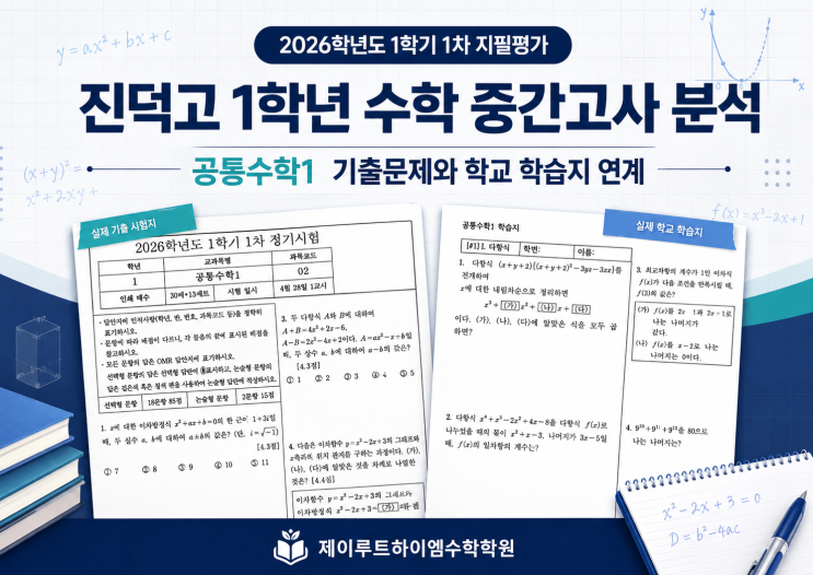 진덕고 1학년 수학 중간고사 분석 공통수학1 기출문제와 학교 학습지 연계까지 함께 살펴보았습니다 안녕하세요. 제이루트하이엠수학학원입니다. 이번 글에서는 2026학년도 1학기 1차 지필평가 진덕고 1학년 공통수학1 시험을 분석해보려 합니다. 단순히 “어려웠다”, “쉬웠다”를 이야기하는 수준이 아니라, 실제 시험지와 학교 학습지를 함께 놓고 보며 시험이 어떤 구조로 출제되었는지 학교 학습지와 어떤 방식으로 연결되었는지 어떤 문항이 변별력을 만들었는지 앞으로 어떻게 대비해야 하는지 까지 정리해보겠습니다. 이번 진덕고 1학년 시험은 공통수학1 전 범위를 고르게 반영하면서도, 후반부로 갈수록 조건 해석 능력과 사고력을 요....... <img src="https://blogthumb.pstatic.net/MjAyNjA0MjhfNSAg/MDAxNzc3Mzc4ODI0NDk1.9n6A6vXoQKqMVO4RrGpiby6ZYYlZN6O1TwEnJdlieDsg.3557OV0KMYnK2FPlW84-E7pohQg0D-4K6OJf9DC4QKMg.PNG/ChatGPT_Image_2026%B3%E2_4%BF%F9_28%C0%CF_%BF%C0%C8%C4_09_19_43.png?type=s3" />