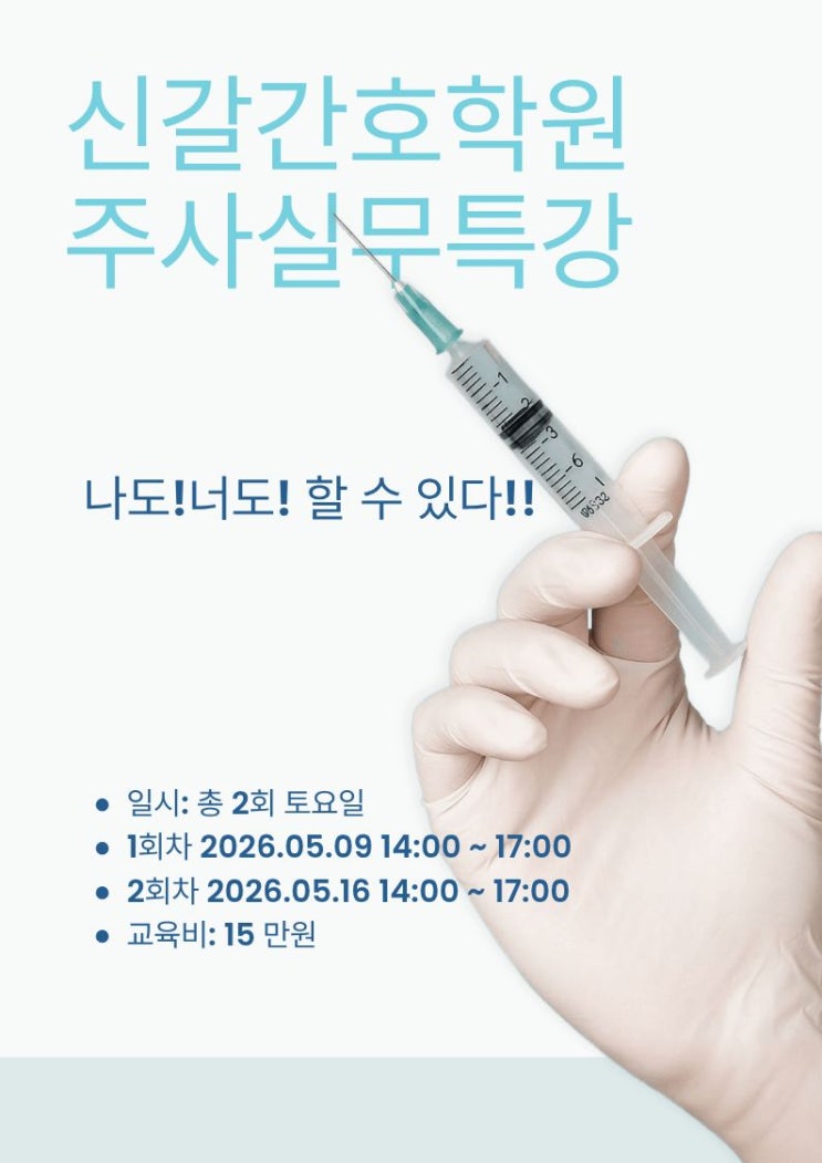 안녕하세요~~!! 3월 국시후에 많은 학생들이 취업을 하셨어요!!! 주사를 배우고 싶다는 문의가 많아지고 있어서 신갈간호학원에서 준비했습니다. 간호조무사 주사 실무특강을 집중적으로 할수 있도록 교육을 마련했습니다. 이론은 이제 그만!!!! 실무가 더 중요해!!!! 실무(정맥주사)로만 짜여진 알찬 특강 입니다. 소수정예 인원으로 운영하여 1:1 맞춤 지도를 실시할 예정입니다. 모집 대상 : 자격증 취득자 및 졸업생 ( 선착순 8명 ) (본원 졸업생 및 간호조무사 자격증 취득 후 임상에서 근무 중 이나 주사실무에 어려움을 겪고있어 특강 교육을 수료하고 싶으신 분들 누구나 신청 가능. 타학원생도 가능합니다) 교육내용 수강생분들은 실제....... <img src="https://blogthumb.pstatic.net/MjAyNjA0MjdfMTYz/MDAxNzc3Mjc1MTIyOTMw.EEzFPcSKsVBeFiehDjL_J6nbEEXMR2rBDPNyw0gyVQcg.LwFzbARLDKw-cHXeSkpttL603mYWuAEYUS0awoHqG-Mg.JPEG/%C1%D6%BB%E7%C6%AF%B0%AD202605.jpg?type=s3" />
