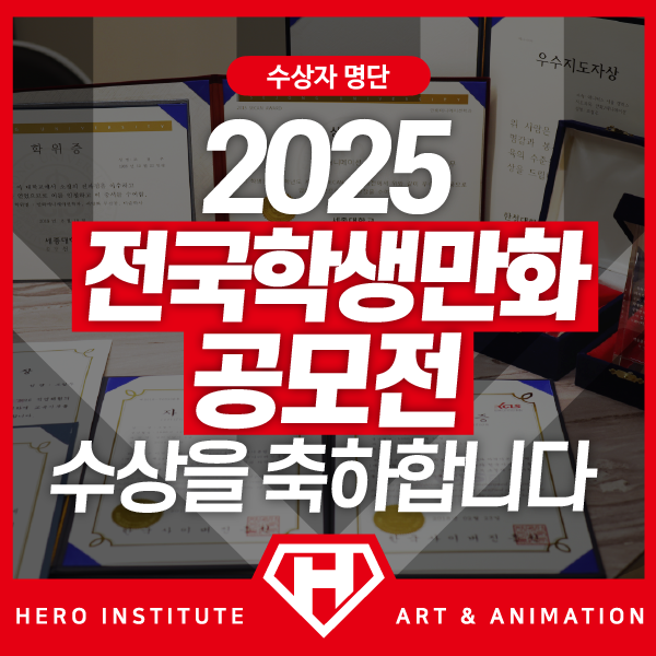 안녕하세요, 새로운 실기 영웅들이 탄생하는 곳! 만화·애니·게임·영상콘텐츠 분야의 전문 미술교육 브랜드 용인미술학원, 죽전미술학원으로 유명한 히어로애니입니다! 오늘은 정말 자랑스럽고 기쁜 소식을 전해드리게 되었는데요. 바로, 지난 2025 한국만화영상진흥원에서 주최하고, 경기도와 부천시, 만화가협회 등의 기관에서 후원한 <2025 제6회 전국학생만화 공모전>에서 저희 히어로애니 수강생들이 무려 5명 수상이라는 놀라운 성과를 이루어냈습니다! 특히, 2025 제6회 전국학생만화공모전에서 히어로애니 브랜드 단독 성과로 <금상 1명 / 은상 1명 / 특별상 1명>이라는 굵직한 성과를 비롯해 다양한 부문에서 당당히 이름을....... <img src="https://blogthumb.pstatic.net/MjAyNTExMThfMjk0/MDAxNzYzNDQ3MDQ5MzU2.Qjkac5xPyz5eExpeTMtuuiI5Gx-cYCxmxqaLz1pPcMMg.vZpf6sj0GMa0CTwVvkV9J-dAKBe_nLOKotGJXugeoUgg.PNG/0-0.png?type=s3" />
