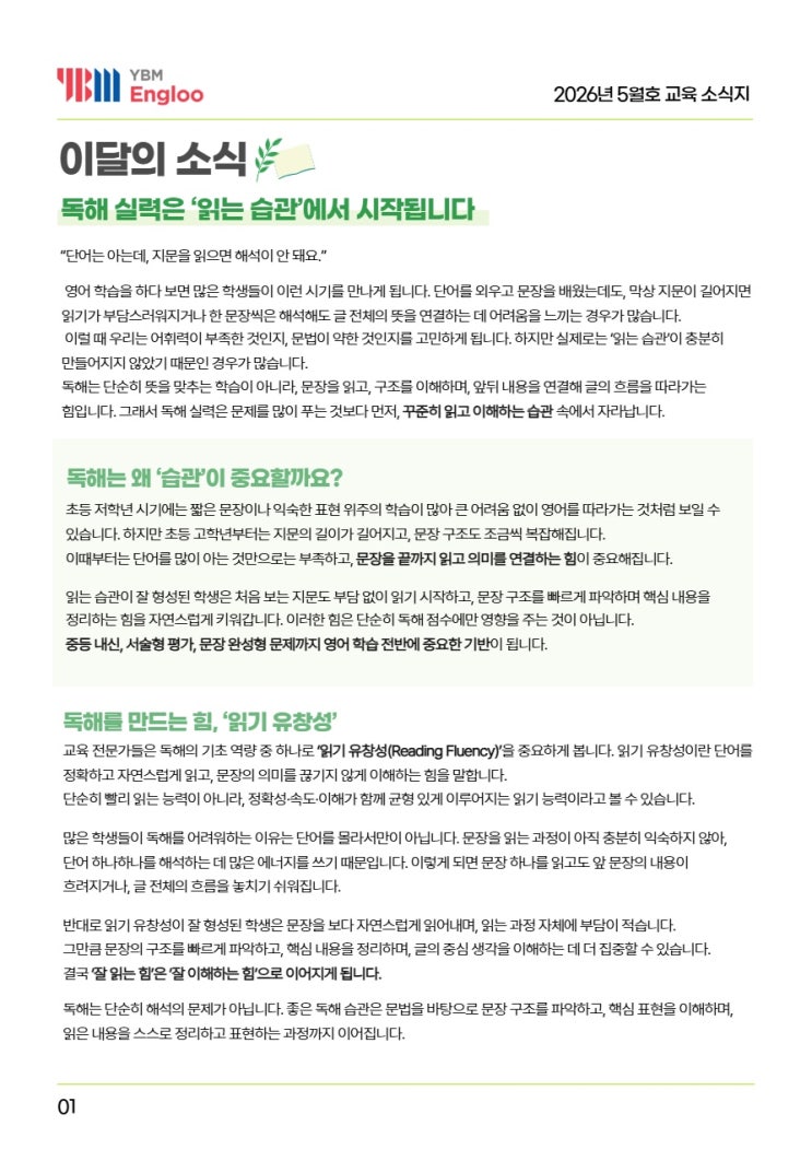 잉글루 용인상현 5월 소식지- 독해 실력은 '읽는 습관'에서 시작됩니다