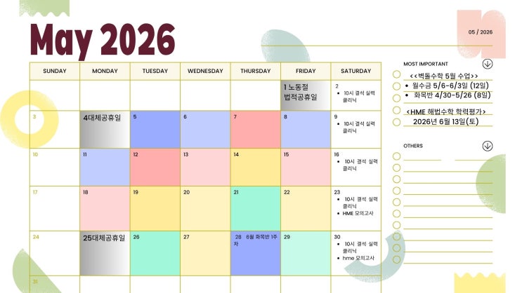 완연한 봄이 왔네요 벚꽃도 벌써 피고지고, 5월은 행사도 휴일도 많지만 에너지 가득한 달이라 아이들이 생기가 느껴지는 달이라 기대가 됩니다 <<벽돌수학 5월 수업 안내문>> ●수업일정 월수금반 5/6- 6/5 (12회) 화목반 4/30-5/26 (8회) ●휴일 5/1(금) 노동절-법적 공휴일 5/4 (월) 재량 휴업일 5/25(월) 대체 휴일 월수금 반에 휴일로 인한 수업일수는 6월 초까지 수업일수에 포함되며 차질 없이 꼼꼼히 진행하겠습니다 단 주2회 등원하는 학생에게는 개별 연락하여 수업합니다 ●HME 학력평가 일년에 두번 있는 학력평가가 있습니다 천재교육에서 실시하는 전국단위 학력평가 입니다 날짜 6월 13일 토요일 중1 1학기까지 특별....... <img src="https://blogthumb.pstatic.net/MjAyNjA0MjNfMjY4/MDAxNzc2OTIwMTEyMTE1.O5i29CoawXym0fVTbZFouN6rE1pfJQRZlQiV5OKyWiMg.ozkkpD1YHRWsVkMk4CSASNGyjOhQ5xs1CizAB-QXjngg.JPEG/4%BF%F9.jpg?type=s3" />