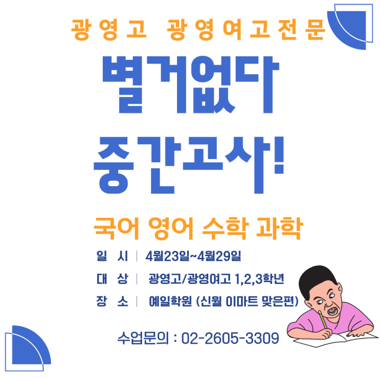 안녕하세요 예일학원입니다. 2026년 1학기 중간고사가 이제 곧 끝납니다. 예일학원에서도 정말 많은 노력을 쏟고 학생들 역시 노력해 주었는데요? 오늘은 간단하게 광영고 광영여고 학생들이 예일학원에서 어떻게 내신대비를 진행 중인지 성과는 어떠한지! 알아보도록 하겠습니다. 다른 학교 학생들과 섞어서 수업을 구성하는 학원과는 달리 예일학원은 광영고 / 광영여고 학생들에게만 맞춰진 수업과 커리큘럼 그리고 학사일정을 구성합니다. 그렇기 때문에 너무 과한, 지엽적인 내용들은 최대한 지양하며 학교 선생님들의 수업과 유인물들을 기반으로 하는 수업을 구성합니다. 광영고 광영여고 기출문제를 포함하여 타 학교 시험문제들 중에서....... <img src="https://blogthumb.pstatic.net/MjAyNjA0MjdfMTQ3/MDAxNzc3Mjk1OTYxMzA5.zX8NEb3Y8V2QuS1VgzIyVfGc9zVqZzWlww2GLgHGzPYg.NaXa395hcJSA_QM_ZDjuDFHdbaV7ujaYW1AIwwzvI7wg.PNG/1.png?type=s3" />