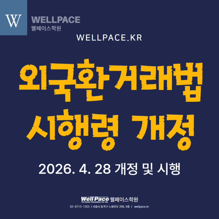 안녕하세요! 외국환거래법 시행령이 2026. 4. 28 개정 및 시행되어 안내해 드립니다. 관세사 시험에 적용되는 기준은 시험일 현재 법령이므로 2026년 관세사 2차 시험을 준비하시는 분들은 모두 반영하셔야 합니다. 2026년 관세사 2차 시험 모두 합격하시길 기원합니다. 신구조문대비표 「외국환거래법 시행령」 2026. 4. 28 개정 및 시행 신구조문대비표 「외국환거래법 시행령」 2026.3.24 개정 및 시행 <img src="https://blogthumb.pstatic.net/MjAyNjA0MjhfMTg3/MDAxNzc3MzQ2MjE5NDU2.N8vqFL0aETyR8hXHGUP_4YT3HzttuRDWKQCsPdpxk4kg.ApoaWL8y4LFpk5Vgip_IwLiXI0whFK9O1lv9WS1nwEcg.PNG/%B9%FD%B7%FC%B0%B3%C1%A4_%282%29.png?type=s3" />