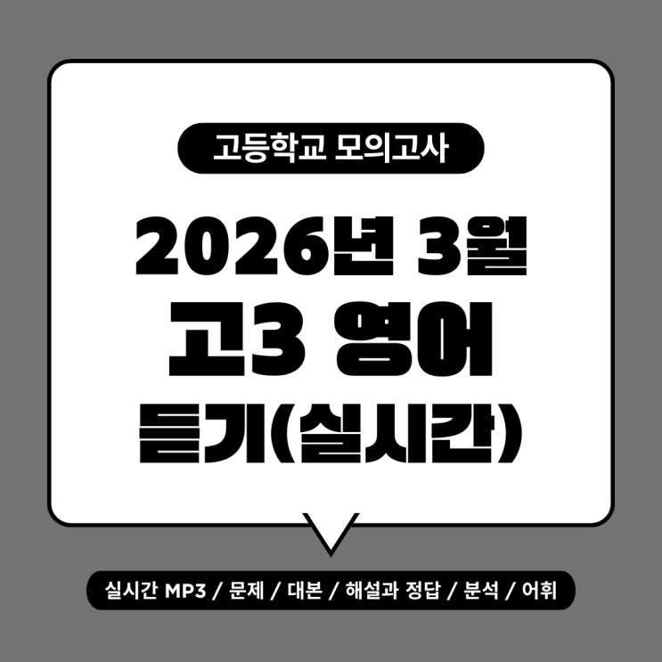 2026년 3월 고2 모의고사 영어 듣기를 편하게 공부하기 위해 실시간 MP3, 문제, 정답, 대본, 해설, 해석을 제공해 드립니다. 공부 방법은 이렇습니다. 2026년도 고1, 고2, 고3 모의고사 영어 듣기 3회분을 풀어본다. (학년에 상관없이 3회분 풀어본다.) 틀린 문제는 이 블로그에서 듣기를 다시 들으며 대본의 해석과 정답이 되는 설명을 읽어본다. 2번 항목을 휴대폰에서 5회 이상 반복한다. (하루에 1회, 5일 동안 반복하면 효과가 좋다.) https://www.eduinsightme.com/2026/04/2026-3-3.html https://www.eduinsightme.com/2026/04/2026-3-2.html https://www.eduinsightme.com/2026/04/2026-3-1.html 틀린 문제에 집중하세요, 그래야 실력이....... <img src="https://blogthumb.pstatic.net/MjAyNjA0MjhfMzMg/MDAxNzc3Mzc1NTYxMTYz.hFBt-DyW02hvv32NTc-uYpYnVC6c8JXfIUTKCbu3jr0g.QukXcn0rEOeDX4CR9dgTkpkBd4ITGIi0-ZLJvVnBODMg.PNG/%B8%DE%C0%CE_%C6%E4%C0%CC%C1%F6_2026%B3%E2_3%BF%F9_%B0%ED1_%B8%F0%C0%C7%B0%ED%BB%E7_%BF%B5%BE%EE_%BD%C7%BD%C3%B0%A3_%B5%E8%B1%E2_%2B_%C7%D8%BC%B3%B0%FA_%C1%A4%B4%E4_%282%29.png?type=s3" />