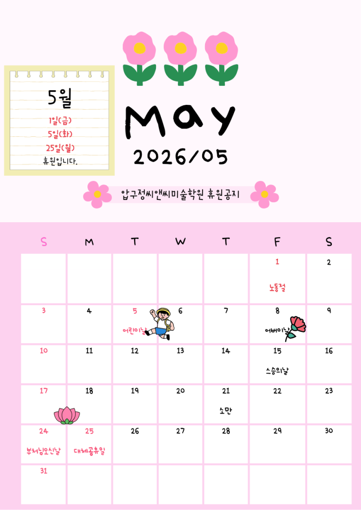 [압구정씨앤씨미술학원] 2026년 5월 휴원 일정 안내
