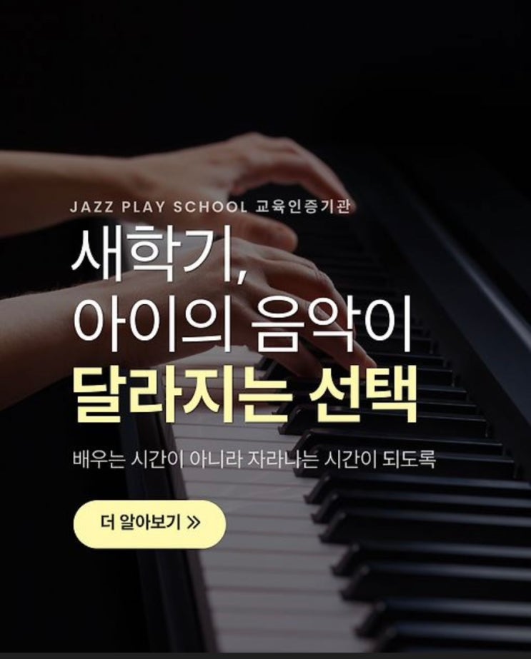 새학기, 아이의 음악이 달라지는 선택. 피아노를 오래 배우는 아이와 '잘' 배우는 아이는 다릅니다. 재즈플레이스쿨 교육인증기관은 단순히 곡을 완성하는 곳이 아닙니다. ✔️ 클래식 위에 재즈 감각을 더해 ✔️ 악보를 읽는 힘을 넘어 해석하는 힘을 키우고 ✔️ 리듬과 표현이 살아있는 연주를 경험하게 합니다. 그래서 아이의 연주는 점점 '빠른 손'이 아니라 '생각하는 음악'이 됩니다. 따라 치는 연주가 아니라 스스로 이해하는 연주. ⠀⠀ ⠀⠀ 새학기, 아이의 시간을 그냥 보내지 마세요. 음악은 기술이 아니라 태도와 사고를 만드는 교육입니다. ⠀⠀ ⠀⠀ Classic × Jazz 재즈플레이스쿨 교....... <img src="https://blogthumb.pstatic.net/MjAyNjA0MjhfMSAg/MDAxNzc3MzM4OTI4MjU3.Yo8OPppd1NdylDp4RBHDjgyY8RIxyHbwIjk6i-zybcQg.5pG6BXqD-5JBs2JEBsR4iodunWcbF56nBxafT71Yt3Eg.JPEG/IMG%A3%DF5415.jpg?type=s3" />