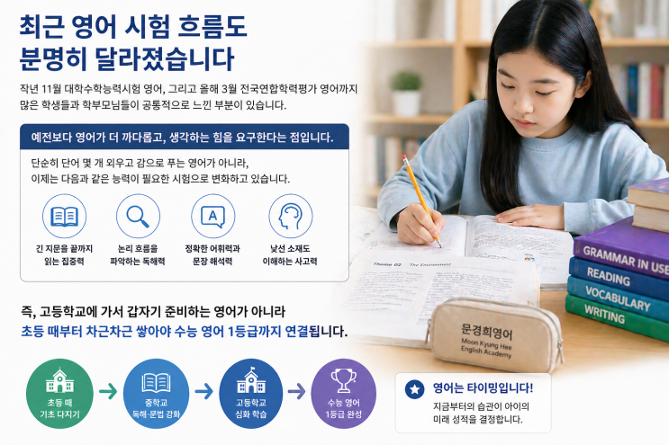 안녕하세요. 대치동 한티역에서 초중고 학생들에게 영어를 지도하고 있는 문경희입니다. 문경희 영어학원 & 문경희 원장 설립연도 : 2006년 (20년 경력) 위치 : 교육특구 대치동(한티역 1번출구 롯데백화점 바로 뒤) 주요 성과 - 서울대, 연고대, 의대, 카이스트 등 명문대 합격 1,000건 이상 - 9등급에서 1등급으로, 전교 1등 도약 등 성적 향상 사례 다수 원장 소개 - 연세대학교 영어영문학과 졸업 - 연세대학교 교육대학원 조기졸업(조기영어교육전공 최우수 장학생) - 연세대학교 교육대학원 교육경영 최고위자 과정 수료 - 연세대학교 일반대학원 인지과학 협동과정 영어교육학 박사과정 - 연세대학교 인지과....... <img src="https://blogthumb.pstatic.net/MjAyNjA0MjhfMiAg/MDAxNzc3MzYyMzM1Mzg1.TN_n1Ii_D-LEg_QnvFyiFNDCrNSJot9DIwPeXyb_lTMg.LlegJl-rDUCaMdJMEdgj8Y1r5iqF8qqecxDCwsfeGAwg.PNG/ChatGPT_Image_2026%B3%E2_4%BF%F9_28%C0%CF_%BF%C0%C8%C4_04_45_23.png?type=s3" />