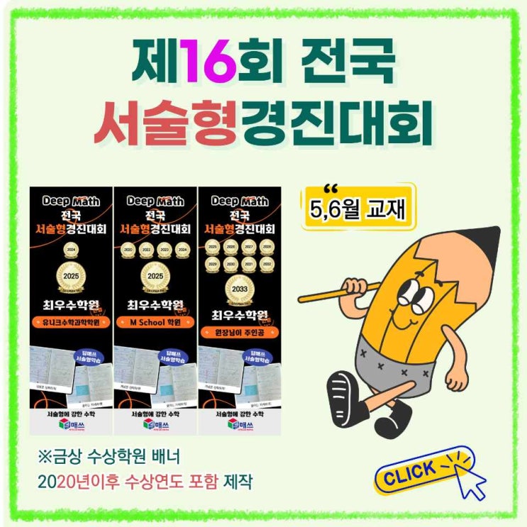 경기도 교육청은 2032학년도 수능부터 서논술형 평가 도입을 공식 제안하고있다. 서울시 교육청도 2033학년도부터 단계적 도입을 발표했습니다. 전국 17개 시도교육감협의회가 이를 최우선 교육과제로 공식 제안하며 전국적 공감대가 형성되었다. 확정은 아니지만 교육의 흐름은 이미 서술형으로 움직이고 있습니다. 지금 초등 고학년이 치를 미래 입시는 답만 맞히는 기술로는 통하지 않습니다. 문제를 분석하고 논리적 근거를 세워 글로 풀어내는 능력, 그것이 입시의 승패를 가르게 됩니다. 서술형에 강한 딥매쓰프로그램 자체가 이미 서술형에 최적화된 시스템입니다. 딥매쓰는 공식 암기가 아닌 개념이 도출되는 과정을 스스로 설명하도록 지....... <img src="https://blogthumb.pstatic.net/MjAyNjA0MjVfMjQx/MDAxNzc3MDgyODQxNjc5.4KVr0pxarmGvHSmdkKlatzMQbKYzO21ENSTT8pgmW-wg.oE_46oOrO8jjEpVOcgSReuObqTy8oZqnVU5PWyqExBYg.JPEG/KakaoTalk_20260425_101549145.jpg?type=s3" />