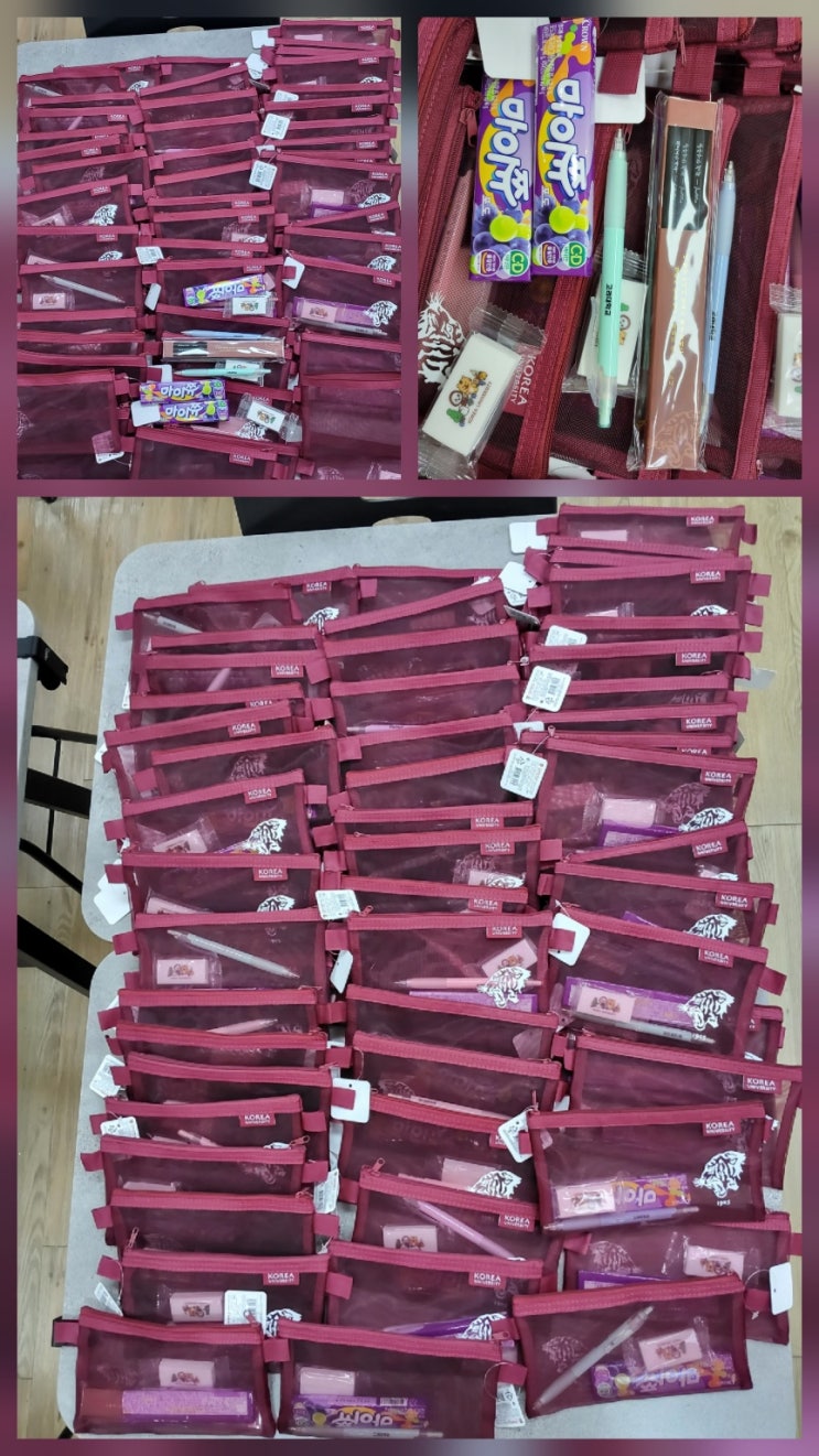 어린이날 행사 준비전 살짝공개 합니다. 선물은 울 아이들이 1년동안 사용할 샤프,지우개,필통 준비했어요. 울 아이들의 4분의1은 작년에 줬던걸 아직도 써줘서 제가 기뻐요!! 저는 이상한 징크스가~ 왜 선물을 준비하는 과정과 줄때는 항상 행복하고 들떠 있는지 제가 신나요!! 없어서 못해주는 내마음 알런지~ 수업 하랴 간식 주랴 오늘은 정신 없는날! 저번에는 급하게 하느라 전자렌지에 콧등이를 찍혔어요~ 한손으느 피 딱고 한 손은 수업하고 눈물이 핑 도는걸 간신히 참았어요. 내가 뭐하는 짓인지? 하면서 그리고 오늘은 그걸 또잊고 울 아이들이 행복해 할 모습을 상상하며 내가 들떠있어요!! 그러면서 이 글을 써요^^ 지금 너무 행복해....... <img src="https://blogthumb.pstatic.net/MjAyNjA0MzBfMTgz/MDAxNzc3NTE3MDEzNDMy.oYivY8juH-lEzc5X-IPH1BUGeqRxA8ScwF1rrgxLG8Ig.a5awFImTqDjfsxOHvsjeAn_zTGyRCbdpN7J9aPzVmCgg.JPEG/KakaoTalk_20260430_114107281.jpg?type=s3" />