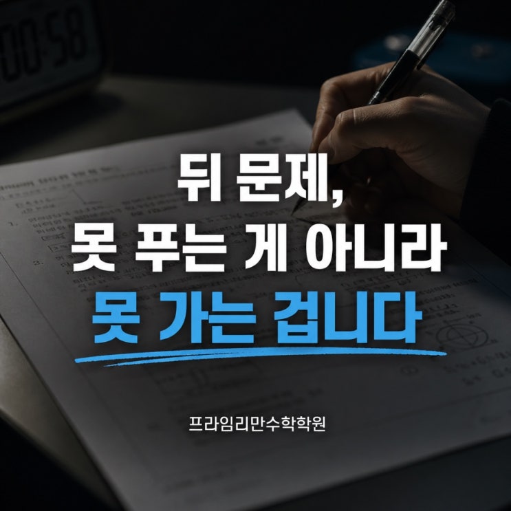 창의고 수학 40점대 학생들, 가장 많이 하는 말이 있습니다. “뒤 문제는 너무 어려워서 못 풀어요.” 맞습니다. 뒤로 갈수록 어려운 건 사실입니다. 그런데 점수가 안 오르는 진짜 이유는 “난이도”가 아닙니다. “문제를 푸는 순서”입니다 왜 뒤 문제를 못 건드리는가 대부분 시험장에서 이렇게 풀립니다. * 앞 문제를 끝까지 붙잡는다 * 막혀도 계속 고민한다 * 시간 부족 * 뒤 문제는 읽지도 못한다 결국 풀 수 있었던 문제까지 놓치게 됩니다 해결 방법은 단순합니다 “끝까지 푼다”가 아니라 “돌아온다”로 바꿔야 합니다 문제가 막히는 순간 필요한 건 포기가 아니라 순서를 미루는 판단! * 1분 고민해도 방향이 안 보이면 표시 * 계....... <img src="https://blogthumb.pstatic.net/MjAyNjA0MjhfMTg0/MDAxNzc3MzUyNjAxMTcw.HvQb3Cab0hX31Itdb3CNzCQkbktQExhk9QHtkFVdXMgg.KJ9Gc5ZwYXFRA5YliitcCRACCakVhY-oGhg4ZbyTX6Mg.JPEG/9AB39182%A3%ADD3CE%A3%AD4EF6%A3%AD8EFC%A3%AD91E525D13710.jpg?type=s3" />