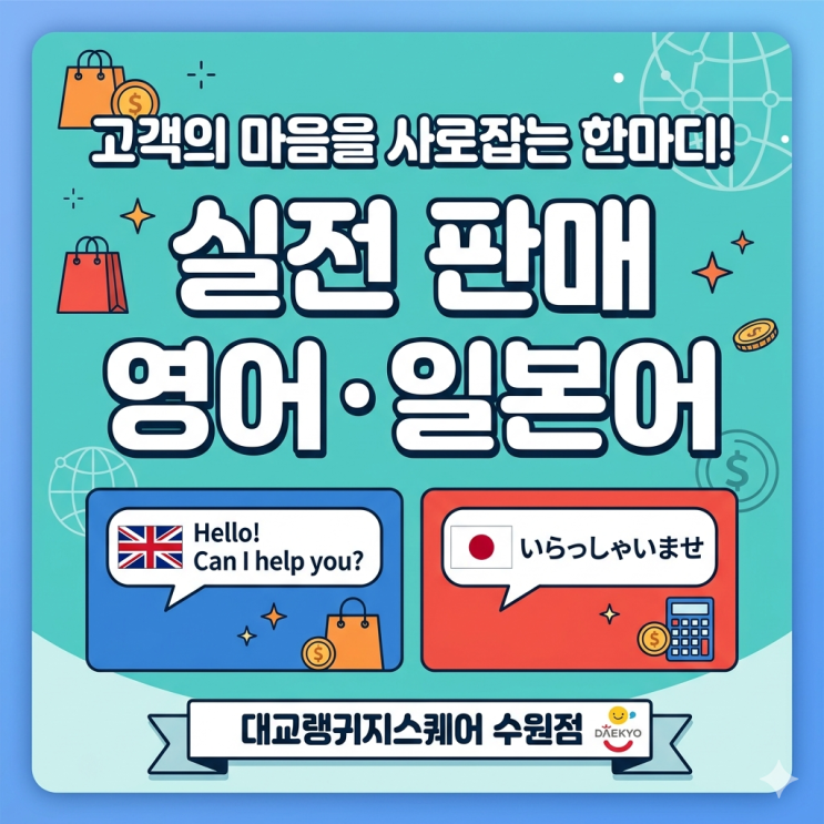 안녕하세요! 대교랭귀지스퀘어 수원점입니다. 최근 K-관광의 인기가 뜨거워지면서 백화점, 면세점, 로드샵 등 판매 현장에서 외국인 고객을 마주할 기회가 정말 많아졌죠? 하지만 갑작스러운 외국인 고객의 질문에 당황해서 알고 있는 단어도 입 밖으로 나오지 않아 고민인 분들이 많으실 거예요. 이런 고민을 해결해드리기 위해, 대교가 실제 매장 상황을 그대로 옮겨놓은 듯한 ‘실전 판매 특화 외국어 교육 과정’을 선보였다는 기쁜 소식을 전해드립니다! 실제 매장 상황 그대로! ‘실전 롤플레잉’ 중심 교육 최근 파이낸셜뉴스 기사(https://www.fnnews.com/news/202604290926017519 참조)에 보도된 것처럼, 대교는 단순히 문법....... <img src="https://blogthumb.pstatic.net/MjAyNjA0MjlfNzYg/MDAxNzc3NDUxNTgyNTI5.fsqvzm6QAKcSHFiQeHKJtKW_5M9BMorI5_uB-CCBT5Ag.v_IlGHbTwQfuMjf6luI4o6KQcDouK-moKFFexFHW6u8g.PNG/%C6%C7%B8%C5%BD%E6%B3%D7%C0%CF.png?type=s3" />