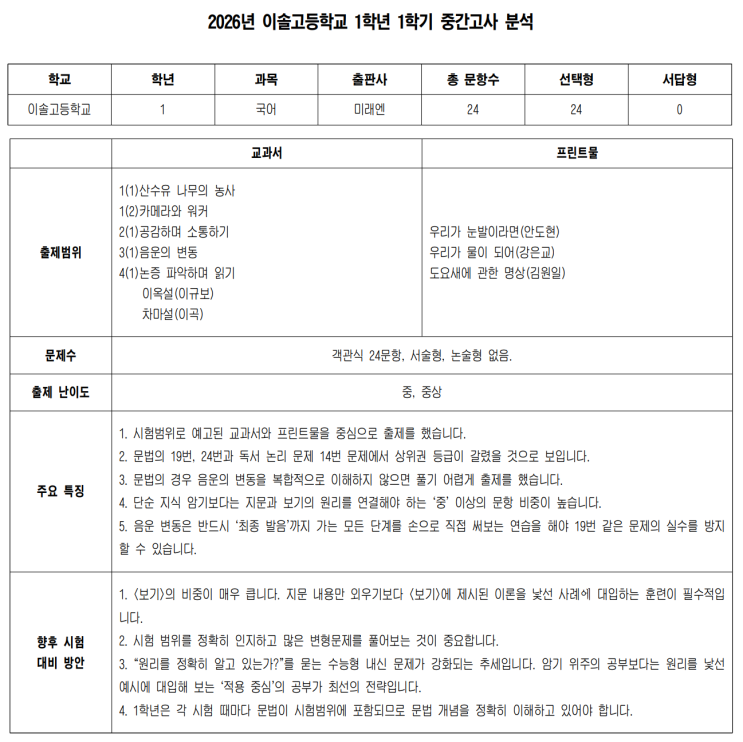 [이솔고]2026년 1학년 1학기 중간고사 시험지 분석