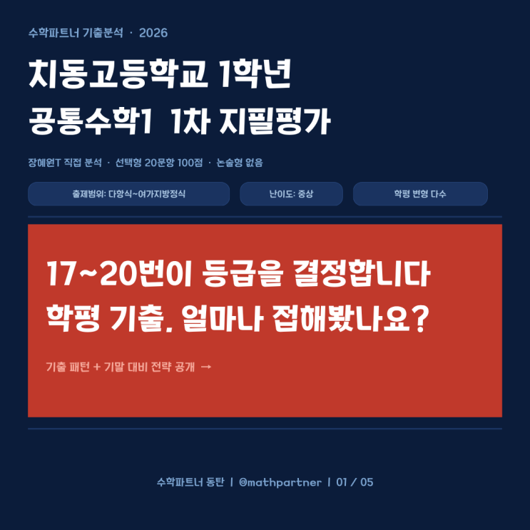 안녕하세요, 수학파트너입니다. 치동고등학교 1학년 학생 여러분, 고등학교 입학 후 첫 지필평가를 치르느라 정말 고생 많으셨습니다. 이번 1차 지필평가는 작년 대비 난이도가 상승하며 많은 학생이 당혹감을 느꼈을 텐데요. 장혜원 선생님이 직접 분석한 이번 시험의 핵심 패턴과 기말고사 필승 전략을 공개합니다! 2026 치동고 1학년 중간고사 요약 이번 시험은 전체적으로 '중상' 정도의 난이도를 보였습니다. 출제 범위: 1. 다항식의 연산 ~ 7. 여러 가지 방정식 (개념원리 기준) 문제 구성: 선택형 20문항 (100점) / 논술형 없음 주요 특징: 작년 대비 난이도 상승, 학력평가(학평) 변형 문제 다수 출제 어떤 패턴으로 출제됐나....... <img src="https://blogthumb.pstatic.net/MjAyNjA0MzBfNzYg/MDAxNzc3NTQwMzczMDkz.jT3osZh1RVgNKO7suWyIN5Bn3EBZrbFVBzjRlt8pQfsg.wQ8N6RcISC9cHNEs6jYT2xnAMDHXmQt6sk0b0QUim28g.PNG/1.png?type=s3" />