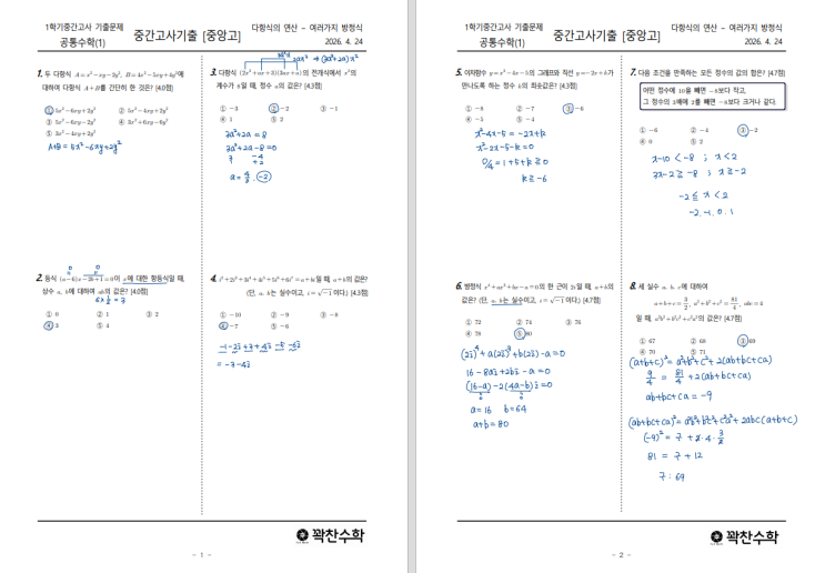 [동탄기출 손풀이] 중앙고1 2026년 1학기 중간고사 분석 이번에 분석해 본 시험지는 중앙고등학교 1학년 1학기 중간고사 공통수학Ⅰ입니다. 직접 손풀이를 진행하며 문제 하나하나의 구조와 출제 의도를 분석해 보았습니다. 시험 총평 이번 중앙고 시험은 확실히 이전보다 난이도는 낮아졌습니다. 하지만 중요한 것은 “쉬워진 시험 = 만만한 시험”은 아니라는 점입니다. ✔ 계산 난이도는 낮아졌지만 ✔ 표현은 더 복합적으로 바뀌었고 ✔ 여러 개념을 동시에 묻는 문제가 증가했습니다. 한 줄 정리 “기본은 쉬워졌지만, 제대로 공부한 학생만 풀 수 있는 시험” 시험 구조 및 특징 선택형 20문항 (100점) /시....... <img src="https://blogthumb.pstatic.net/MjAyNjA0MjdfMTU0/MDAxNzc3MjUxOTYwNjEw.Uksb_0hhv75ZVsXgSDfPcxBHr3MwXTvQ018IWZdtI04g.JGLCjHz9iPo7C7IQPYbxvx-k7pBIS-ICc2HmesSeofwg.PNG/%BD%BA%C5%A9%B8%B0%BC%A6_2026-04-27_092635.png?type=s3" />