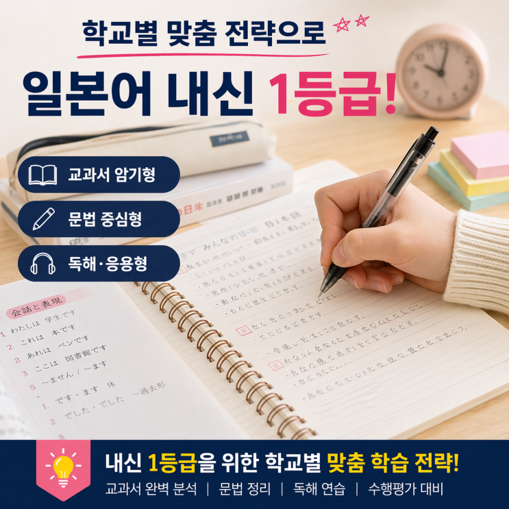 안녕하세요! 대교랭귀지스퀘어 평생교육원 수원점입니다. 고등학교 첫 일본어 시험을 보고 나서 당황한 학생들과 상담을 하다 보면 가장 많이 듣는 고민이 있습니다. "중학교 땐 대충 봐도 A였는데, 고등학교 시험은 손도 못 대겠어요." "옆 학교는 쉽다는데, 우리 학교는 왜 이렇게 어렵죠?" 맞습니다. 고등학교 일본어 내신은 학교별 '시험 스타일'의 격차가 매우 큽니다. 우리 학교가 어떤 유형인지 모른 채 무작정 외우기만 하는 것은 밑 빠진 독에 물 붓기입니다. 오늘은 실제 상담 데이터를 바탕으로 수원·화성·오산 지역 고등학교 일본어 시험의 4가지 핵심 유형을 완전 정리해 드립니다. 1. 우리 학교 일....... <img src="https://blogthumb.pstatic.net/MjAyNjA0MjdfNzEg/MDAxNzc3MjUzMzE4MTA4.bWVibnZ9Jr1bDBBofoRkEsE54ao8dPuMp6jyu9t3JH4g.V2jwdbFXtSqU46sG9oSrs9rrFRKzouCiKyBR4r3CbiYg.PNG/%BD%E6%B3%D7%C0%CF.png?type=s3" />