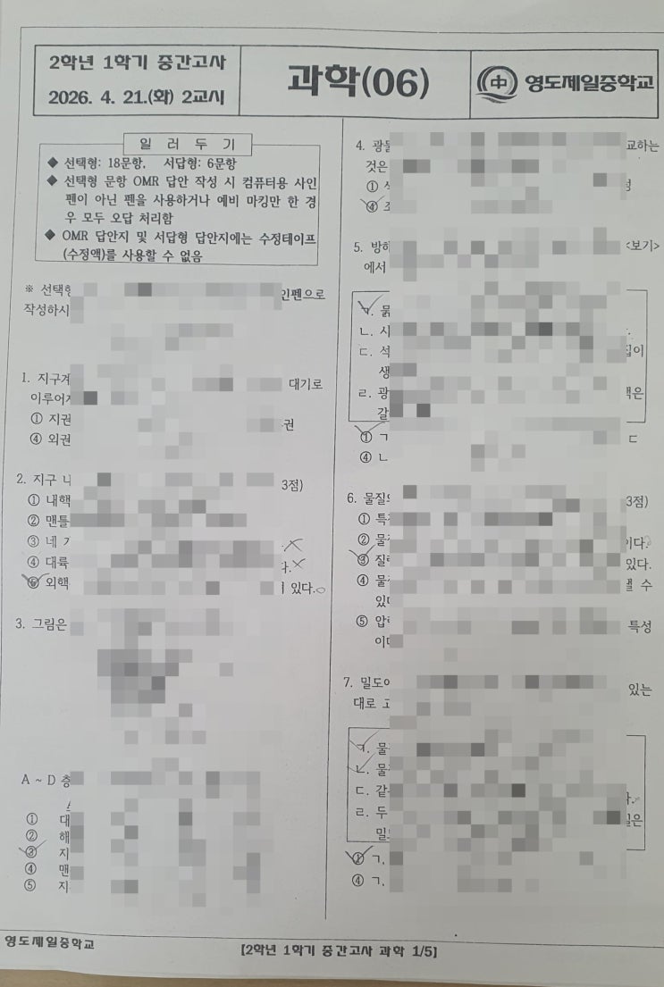 2026학년도 영도제일중학교 2학년 1학기 1차 정기시험 과학 분석. 단원 자체가 어려워서 난이도를 떠나 힘들었다.