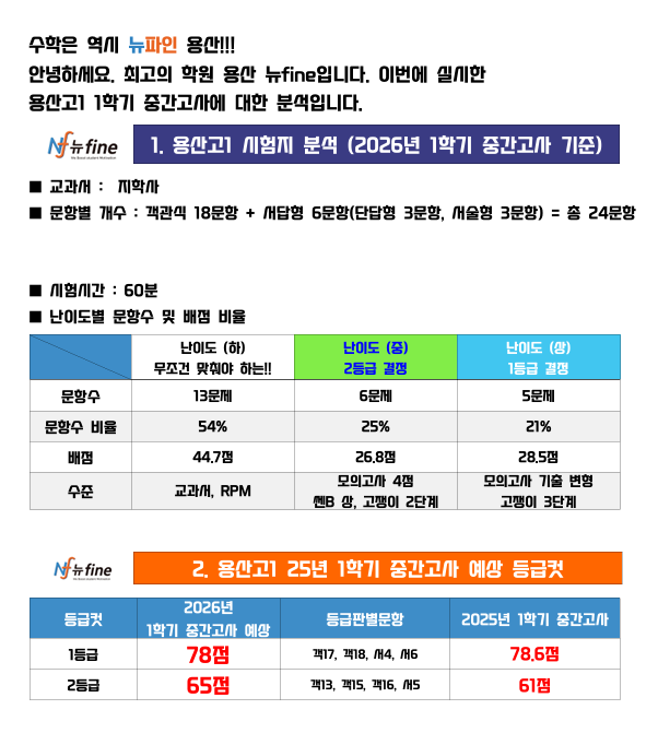 용산고 1학년 2026학년도 1학기 중간고사 수학 시험 분석 안녕하세요. 용산 지역 수학 전문 학원 용산뉴파인 입니다. 오늘은 용산고등학교1학년 1학기 중간고사 수학 시험을 같이 분석하고, 학생들이 어떤 부분에서 점수를 잃었는지, 그리고 앞으로 어떻게 대비해야 하는지까지 객관적으로 정리해 드리겠습니다. 1️⃣ 시험 총평 – “기본은 평이, 변별은 확실” 이번 시험은 전체적으로 보면 기본 개념 문제 비중이 높은 시험이었습니다. 총 24문항 (객관식 18문항 + 서답형 6문항) 시험시간 60분 난이도 구성은 다음과 같습니다. 하 (기본 문제) : 13문항 (약 54%) 중 (개념 확장) : 6문항 (약 25%) 상 (변별 문제) : 5문항 (약 21%) 이를 한....... <img src="https://blogthumb.pstatic.net/MjAyNjA0MzBfMjcy/MDAxNzc3NTM2MzU1Mzg2.ihiSroSJ495gxZ2fdWNpLZG7Of-fx0Hfc3RxeUhfMzAg.XRryWAI1Qu6jLWOlKFXKqBA4egdvcXG9yM6aC0eNCRkg.PNG/image.png?type=s3" />