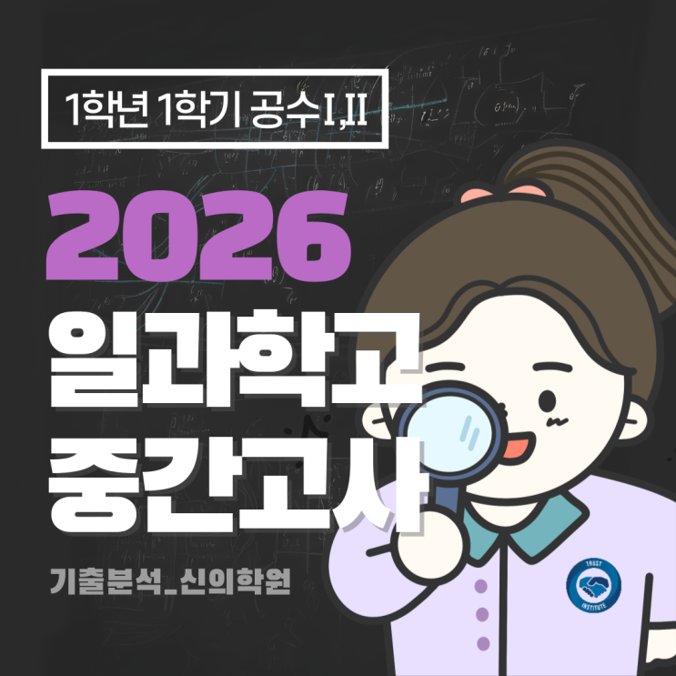 안녕하세요. 과정과 결과로 보답하는 신의학원입니다. 신의학원에서 분석한 "2026 부산일과학고등학교 1학년 1학기 중간고사" 내용은 아래와 같습니다 . 부산일과학고등학교 1학년 1학기 중간고사(공통수학 Ⅰ) OHY 선생님[100점] ▶ 출제 범위 : 다항식의 연산, 항등식과 나머지정리, 인수분해, 복소수, 행렬연산 ▶ 주 출처 : 학습지직접(25%), 학습지간접(15%), 기본내신형문항(10%), 본고사 및 자체문항(50%) ▶ 출제 난이도 : 어려움(3.6점/5.0점) [학습지 연계 출제] 직접 연계 출제는 20~25% 오롯이 학습지 문제만 풀었으면 안된다. 그렇다고 안보면 큰일난다. HM(다항식 ~ 복소수) 학습지 문항을 조금 차수를 높여 변형, 증명....... <img src="https://blogthumb.pstatic.net/MjAyNjA0MzBfMjcx/MDAxNzc3NTQ4OTM5MzM5.lPhJxcUJ_LxW9e6pfQ845QHcA3NKdHsPmh_9zblxu8wg.-16Ku5h76UVUR4_iGPTt_NpkwhpNalLEP90kZ62YFgYg.PNG/%C1%A6%B8%F1%C0%BB-%C0%D4%B7%C2%C7%D8%C1%D6%BC%BC%BF%E4_-023_%282%29.png?type=s3" />