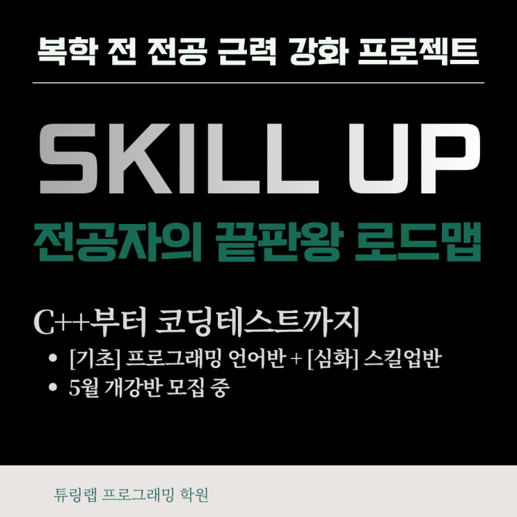 군 복무 후 대학교 복학 준비, C++이 막막한 전공자라면? 부산 튜링랩 10개월 마스터 로드맵 기초부터 실전 코딩테스트 실력까지 안녕하세요, 튜링랩 프로그래밍 학원입니다. 군 복무를 마치고 복학을 앞두고 있거나, 휴학 중 전공 실력을 제대로 쌓고 싶은 대학생 여러분! 설레는 마음 한편으로는 이런 걱정이 들지 않나요? C언어 문법도 가물가물한데, C++ 수업을 따라갈 수 있을까? 자료구조와 알고리즘이 전공 필수라는데, 독학으로 가능할까? 복학 후 전공 수업에서 느끼는 '멘붕'은 여러분만의 고민이 아닙니다. 하지만 그 해결책은 명확합니다. 기초부터 실전 코딩 테스트 실력까지, 튜링랩이 준비한 10개월의 대장정을 소개합....... <img src="https://blogthumb.pstatic.net/MjAyNjA0MjVfNjQg/MDAxNzc3MDk0NDQxNTg4.nQOH7h6T0u10Fx24PNpcKHR73F5ZQSjqzSe4K6fEgOog.Q3U9qcbxgAw63Q0317PoeoaVehtXa-aZQhHhURrKDaMg.PNG/1.png?type=s3" />