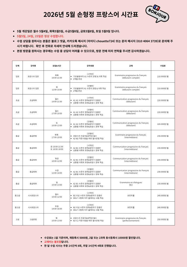 [대구프랑스어학원] 손형정프랑스어 2026년 5월시간표
