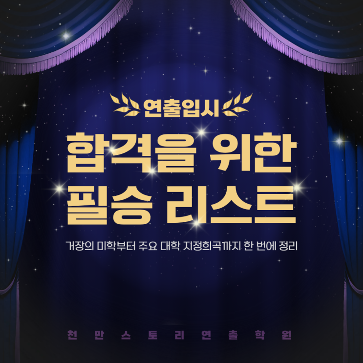 안녕하세요 연출 입시의 맥을 짚어 압도적인 결과로 증명하는 천만스토리 연출학원입니다! 영화와 연극 입시는 단순히 '글을 잘 쓰는 것'을 넘어, '얼마나 깊은 미학적 베이스를 갖추었는가'의 싸움입니다. 특히 한예종, 중앙대, 서울예대 등 최상위권 대학을 목표로 한다면 거장들의 영화 문법과 지정희곡에 대한 심도 있는 이해는 필수입니다. 수험생 여러분의 서재와 재생 목록에 반드시 있어야 할 입시 필승 리스트를 공개합니다. Part 1. 거장의 눈을 빌리다: 영화 입시 필감 리스트 단국대 '이야기구성'이나 주요 대학 면접에서 '가장 감명 깊게 본 영화'를 물을 때, 단순한 상업 영화보다는....... <img src="https://blogthumb.pstatic.net/MjAyNjA0MjZfMjMg/MDAxNzc3MTg3MDcyNjI1.OcsuJ0bzPA6yLLkcHa89OYLWypM75pIrE71B72DMSmUg.v0q22nEGSZhjt0Fjx7qY7tFEYOOymxSinV5o6YPZYGEg.PNG/1.png?type=s3" />