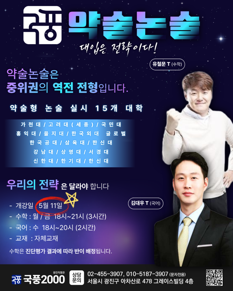 안녕하세요, 국풍2000 광진직영관입니다. 입시 현장에서 많은 학부모님과 학생들을 만나다 보면, "내신 성적이 애매해서 고민이에요", "수능 최저 맞추기가 너무 힘들 것 같아요"라는 고민을 자주 듣게 됩니다. 내신 3~6등급 사이의 중위권 학생들에게 가장 현실적이고 강력한 대안은 무엇일까요? 정답은 바로 '약술형 논술'입니다. 국풍2000 광진관에서 준비한 5월 11일 개강 대비반 소식을 전해드립니다! 왜 '약술형 논술'이 전략인가요? 많은 분이 '논술'이라고 하면 인문 논술의 긴 글쓰기나 수리 논술의 복잡한 증명 과정을 떠올리십니다. 하지만 약술형 논술은 다릅니다! 역전의 기회: ....... <img src="https://blogthumb.pstatic.net/MjAyNjA0MjRfMTA1/MDAxNzc3MDI3MzM2NzUy.8ldQsG6QKUj7TANO0upkX5AjPRen_1EKfopMCB3izRIg.zNCycdfw8_tEnDV9Rgs25Ra2SZIBWjB5P-iKUWXZONwg.PNG/%BE%E0%BC%FA%B3%ED%BC%FA%C8%AB%BA%B8_%B9%EA%B5%E5.png?type=s3" />
