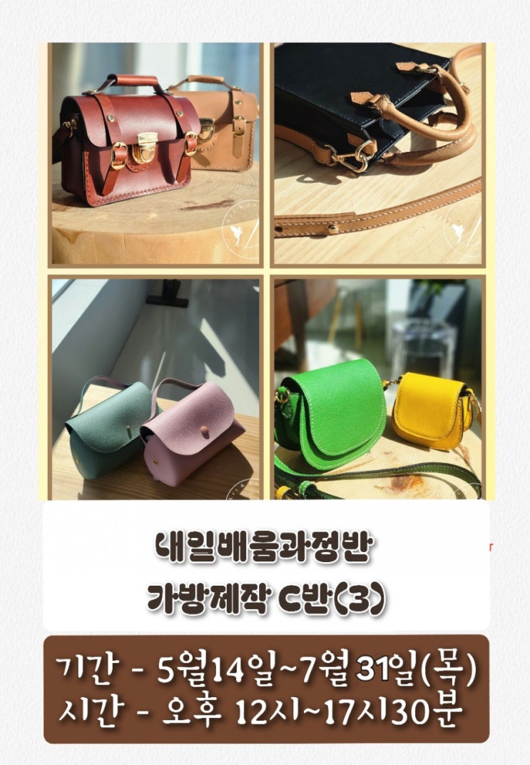 (내일배움과정반 시간표) 많은분들이 평일 오후 가방제작반 개설을 원하셔서 추가 강의 개설하였으니 현재 나와 있는 각 과정반 시간표 확인하셔서 수강신청 비랍니다^^* (평일 오후 가방제작반) 가방제작C반 -매 주 목요일 12시~17시30분 *기간 5월14일~7월30일* (평일 오전 가방제작반) 가방제작A반-매 주 화/금요일 9시30분 ~13시30분 *기간 5월15일~7월31일 (평일 오후 소품제작반) 소품제작A반-매 주 월/수요일 13시30분 ~17시30분 *기간 5월18일~6월24일 *내일 배움카드 비소지자이신 일반분들도 내일배움 과정반 수강신청 가능합니다. *과정 수료후 가죽공예 지도자 자격증 발급 요건 자격이 부여됩니다. (수강문의전화 ☎️) 010-8480-14....... <img src="https://blogthumb.pstatic.net/MjAyNjA0MjVfMzkg/MDAxNzc3MTIwMDg2MDgx.K91tKqL2LFGW0XRy2tH0wNsaWKZwTPYufcE1AxSpj-4g.Q89uNy8c8g7A79gCC1TAnBaimK9FWZUUtn4l9oCrY2kg.JPEG/GridArt%A3%DF20260425%A3%DF210722006.jpg?type=s3" />