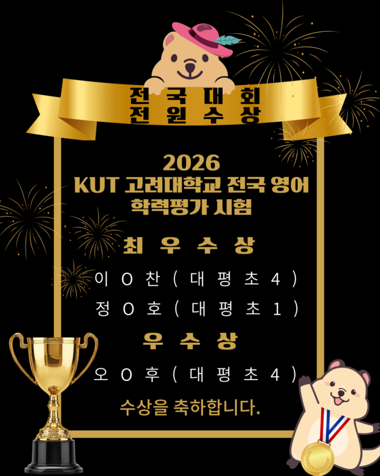 #말하기대회 ✨2026 KUT 고려대학교 영어말하기 대회✨ 대평초점 참가자 전.원.수.상 (최우수상 2 & 우수상 1) 대평초점 링키즈들과 Anna의 첫 외부대회 도전이었는데, 이렇게나 멋진 결과를 이루어주어 너무 대견하고 고마울따름 열심히 참여해준 친구들에게 Anna티쳐의 마음 듬뿍담은 ‘보너스 상’도 전해주었지요 어떤 상인가가 중요한게 아니라 무언가에 용기내어 도전하고 성취해가는 과정의 즐거움을 우리 친구들이 느껴가며 성장하길 바래요- 곧 메달과 상장도 전달드릴께요 (다음엔 더 많은 친구들과 함께 도전해볼께요) #링키영어세종 #세종영어 #세종초등영어 #세종유아영어 #대평동영어 #대....... <img src="https://blogthumb.pstatic.net/MjAyNjA0MjhfMTA5/MDAxNzc3MzQyMDQ0NTM1.blgyt1uX7qh4XpwV__Xmtb_JVufhgWRuVQEfKDz4aQYg.WXlGDHI24eGsw5KCWpvjaZS2Z6y140I4MT9XVerdW-4g.PNG/%B0%CB%C1%A4_%B1%DD%BB%F6_%C8%AD%B7%C1%C7%D1_%C5%C2%B1%C7%B5%B5_%B4%EB%C8%B8_%BC%F6%BB%F3%C0%DA_%B9%DF%C7%A5_%C0%CE%BD%BA%C5%B8%B1%D7%B7%A5_%B0%D4%BD%C3%B9%B0.png?type=s3" />