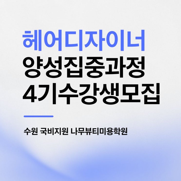 헤어디자이너 실무 국비교육 수원 디자이너양성 집중과정 안녕하세요. 블로그지기입니다. 언제까지 준비만 하실건가요? 헤어디자이너를 꿈꾸며 기초도 배우고 커트도 어느 정도 해봤는데, 막상 살롱에 나가기엔 뭔가 부족한 것 같고, 그렇다고 다시 처음부터 배우기엔 시간이 아깝고, 이런 애매한 상황에 머물러 있는 분들 생각보다 정말 많습니다. 준비가 완벽해지길 기다리다 보면 타이밍을 놓치게 됩니다. 지금 필요한 건 더 많은 이론이 아니라, 실제 살롱 현장에서 통하는 실력입니다. 수원 나무뷰티미용학원의 헤어디자이너 양성 집중과정은 바로 그 마지막 한 걸음을 완성시켜 드리는 과정입니다. 디자이너 양성 집중과정, 무엇이 다른가....... <img src="https://blogthumb.pstatic.net/MjAyNjA0MjNfMTEg/MDAxNzc2OTMzMjA3NjYx.Nm7M9Pl5ivOJTbWLERt-tasFvFbLvxwdPy-A-0raRJ0g.dJjLiMTt-l4v_Olj6eWuB0jSMOsSTdphmYm1kle8ewcg.JPEG/%BA%ED%B7%E7.jpg?type=s3" />