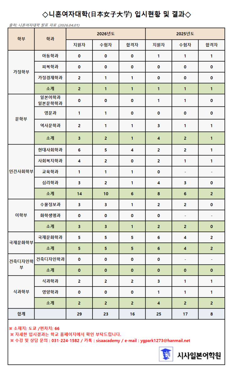 [사립/일본유학/니혼여자대학] 2025~2026학년도 입시결과